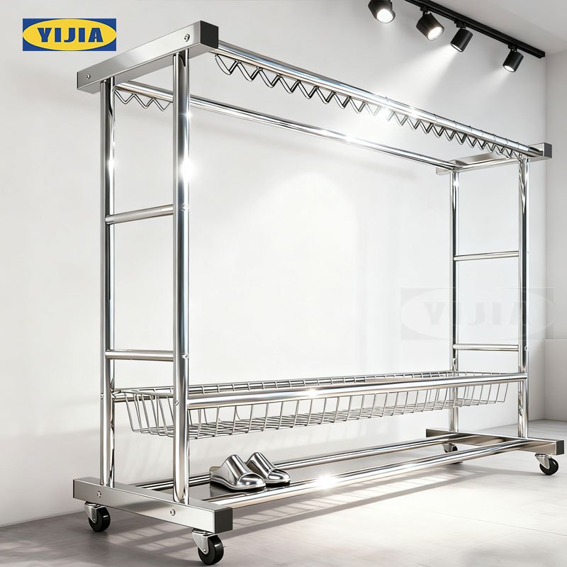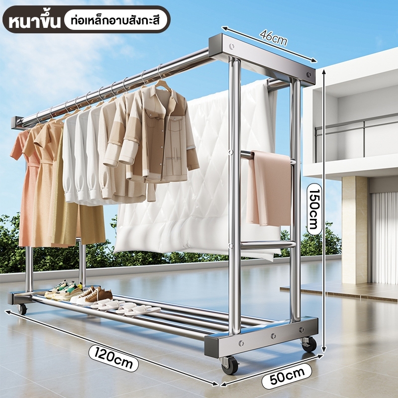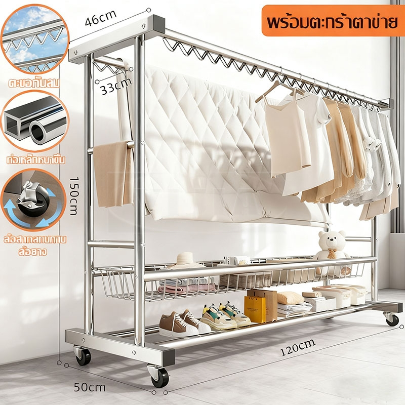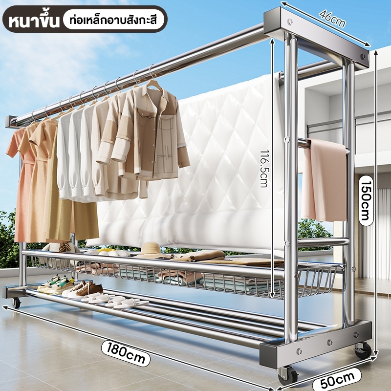 YIJIA🔥รุ่นอัพเกรด🔥ราวตากผ้า ราวตากผ ้าสแตนเลส ราวตากผ้าท่อเหล็กสองแถว มาพร้อมตะกร้า กันลมได้ดี มั่นคง