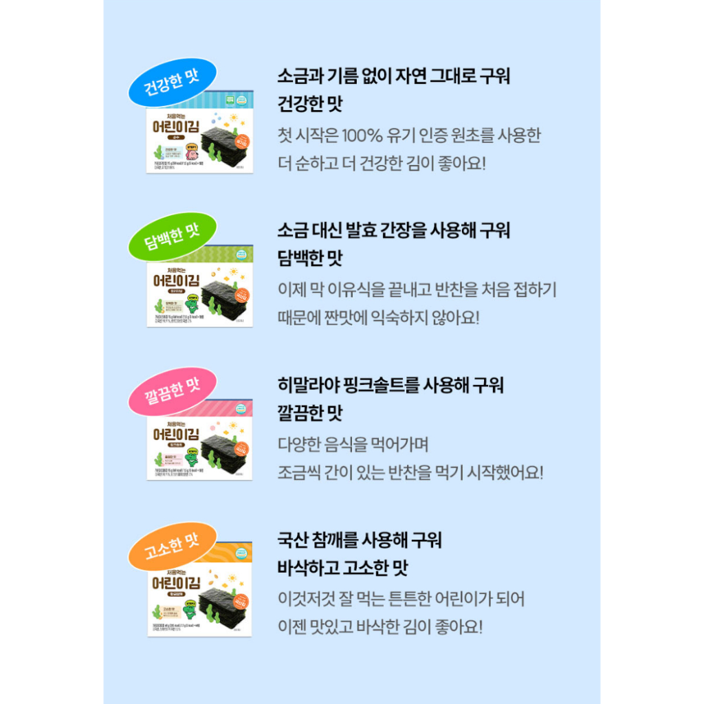 [Bebecook] สาหร่ายทะเลเกาหลีสําหรับเด็ก – รสดั้งเดิม / บริสุทธิ์ / เกลือสีชมพู / แผ่นงาทองคํา & เกล็ดสาหร่ายสับ | ขนมเพื่อสุขภาพ