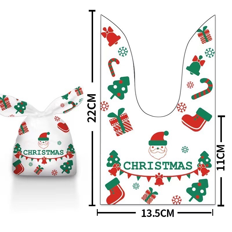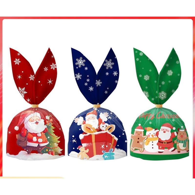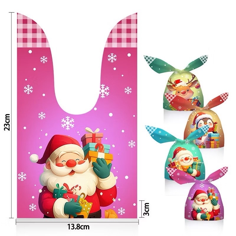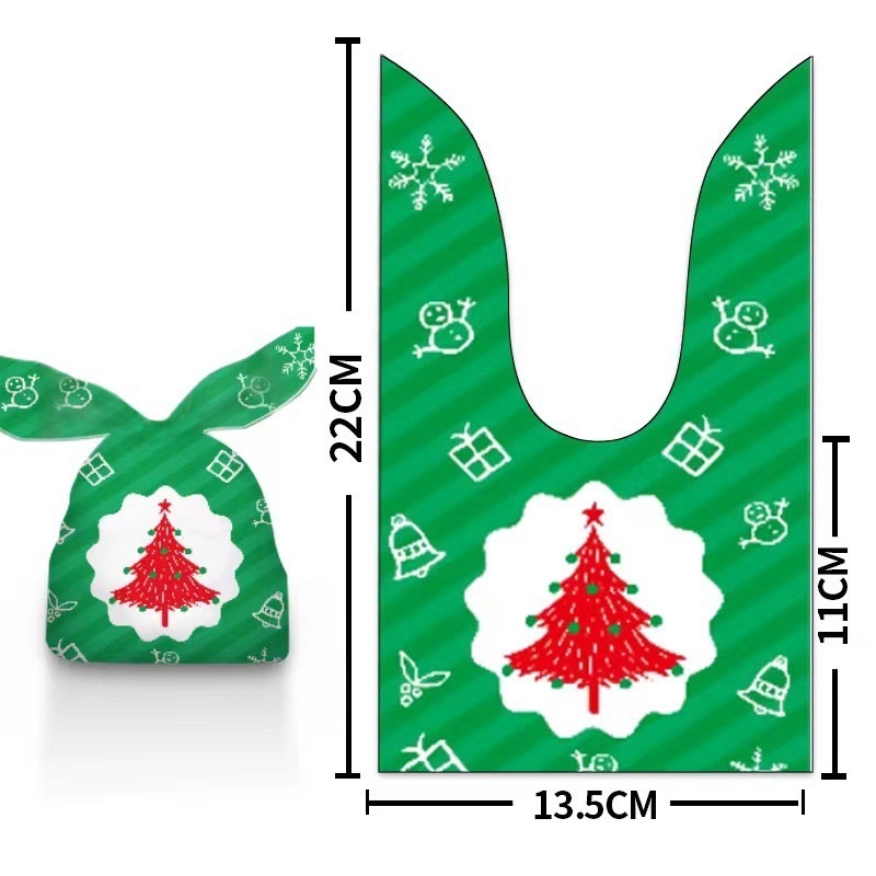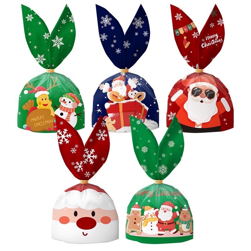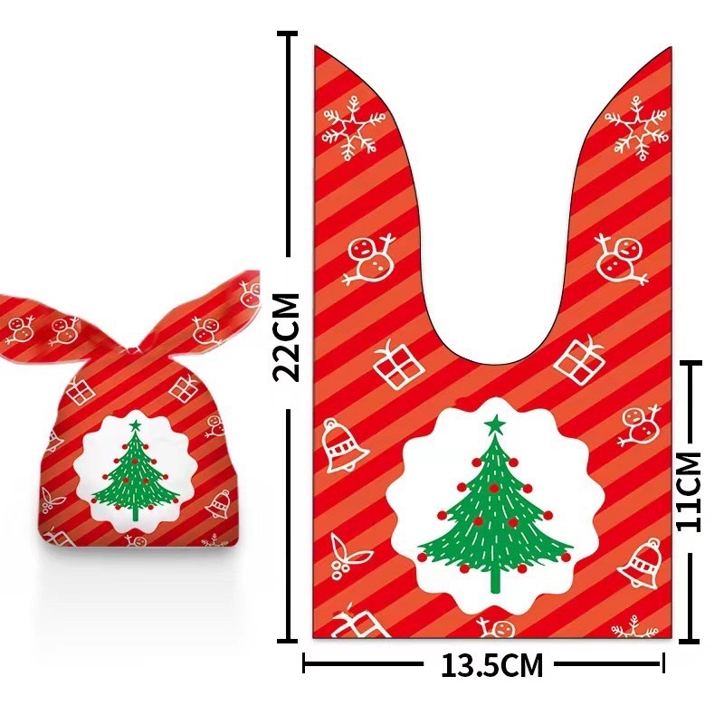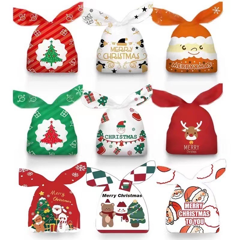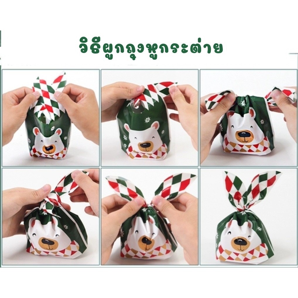 ถุงผูกหูกระต่ายใส่ขนมลายน่ารัก แพ็คประมาณ 5 ใบ ใบมีลายคริสมาสต์นะคะ