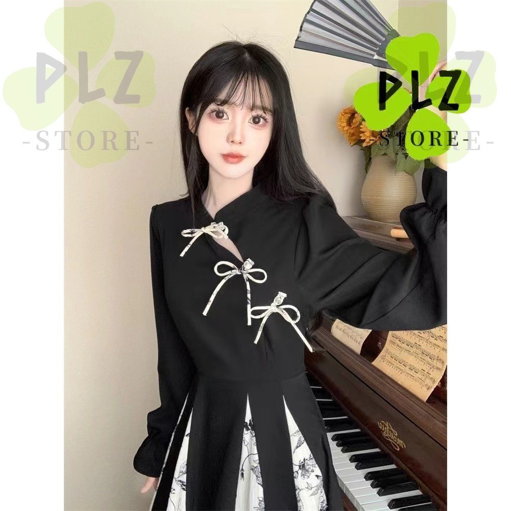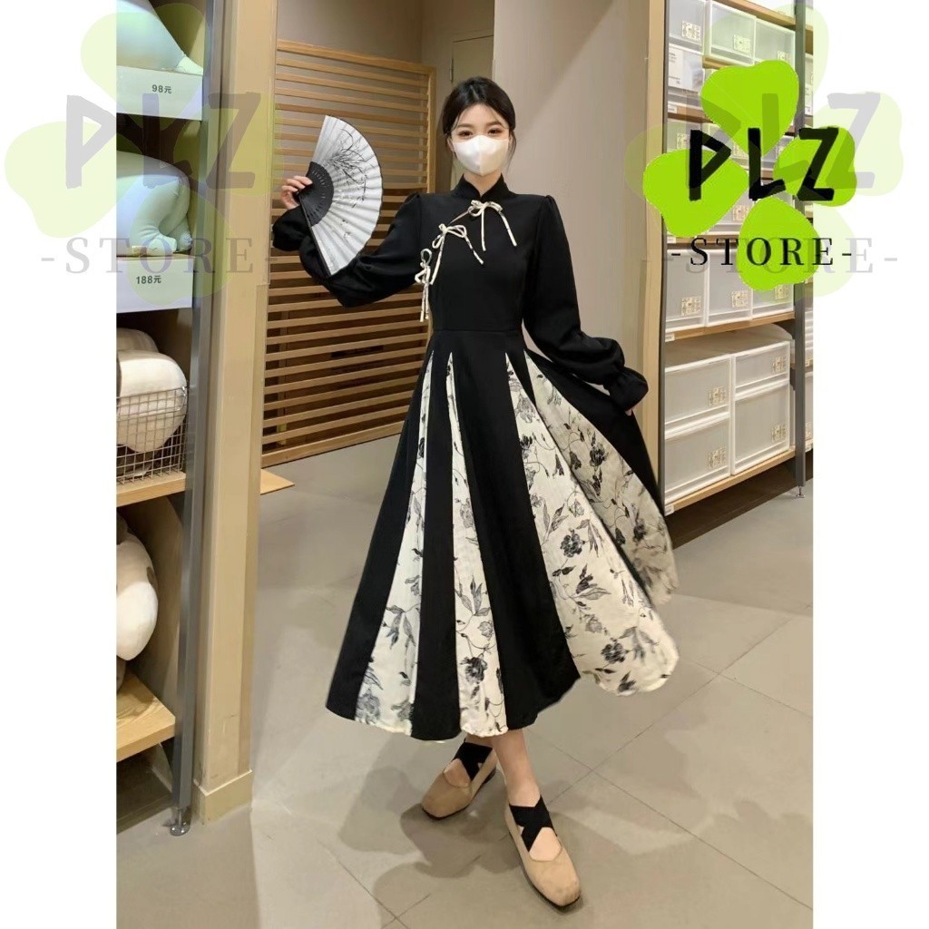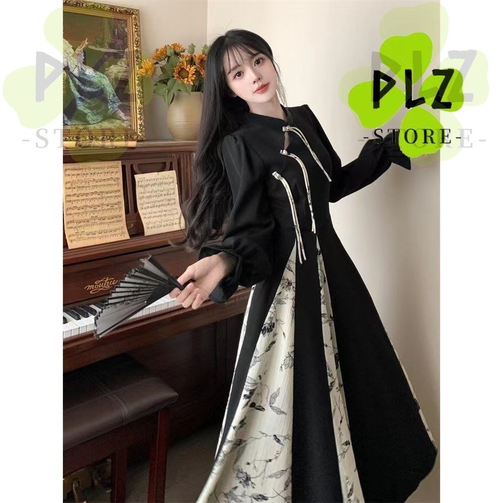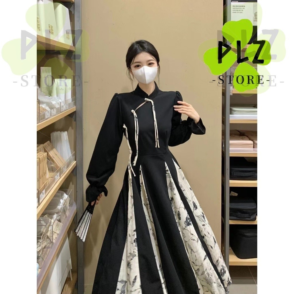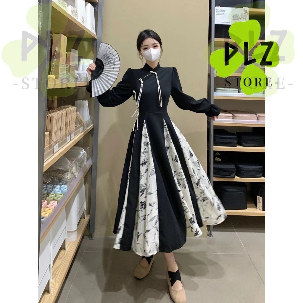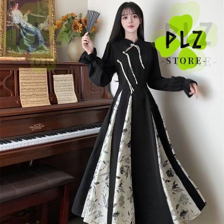 กี่เพ้า สไตล์ผู้หญิงสุภาพสตรีวินเทจฤดูใบไม้ร่วงฤดูหนาวแขนยาวหลวมดอกไม้พิมพ์จีบ แมกซี่ ยาวแกว่งพรรคชุด