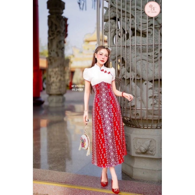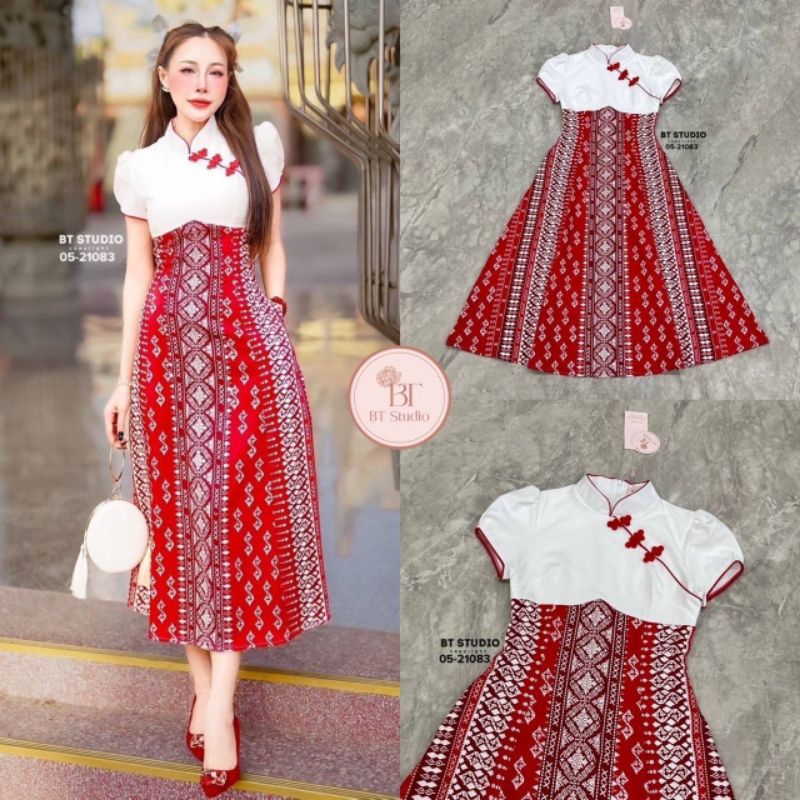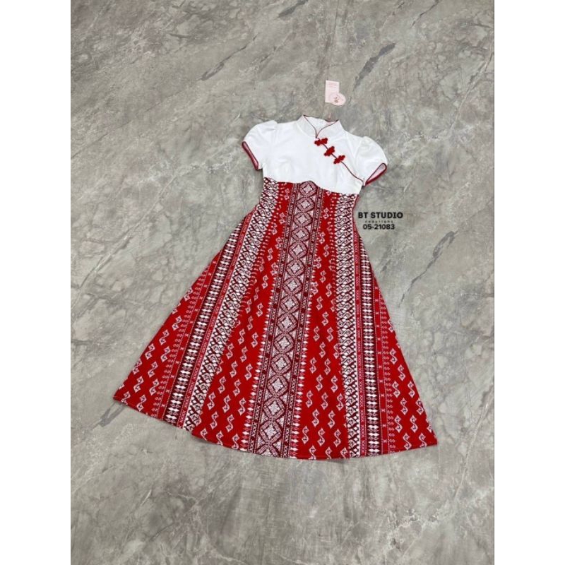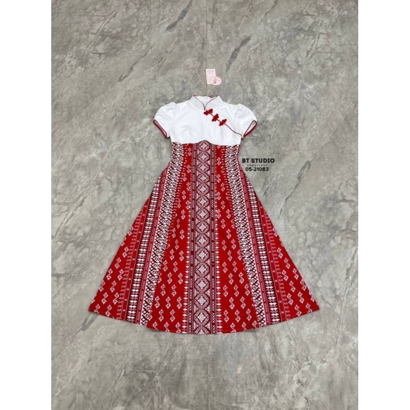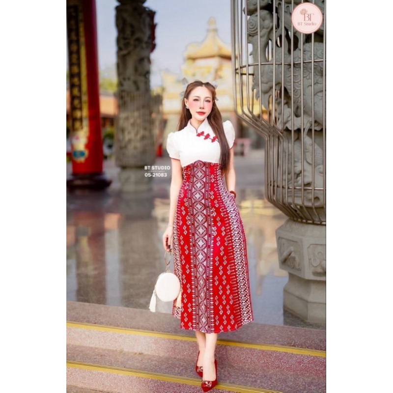 BT เดรสยาวคลุมเข่าแขนสั้น ช่วงคอดีไซส์คอจีน ช่วงบนสีขาว แต่งสายเฉียงติดกระดุมจีนสีแดงครึ่งตัวล่างแต่งผ้าถุงประยุกต์