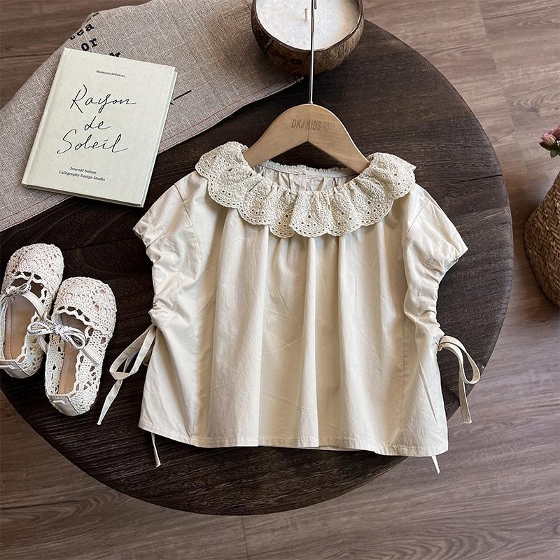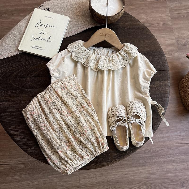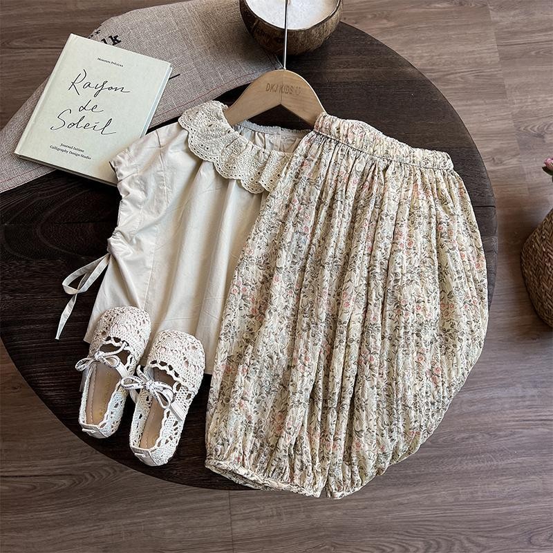 ชุดสองชิ้นเสื้อยืดแขนสั้นสำหรับเด็กผู้หญิงฤดูร้อน + กางเกงลายดอกไม้ แฟชั่นใหม่สไตล์โมริ ชุดฤดูร้อนสำหรับเด็กผู้หญิง กางเกงกันยุงลายดอกไม้