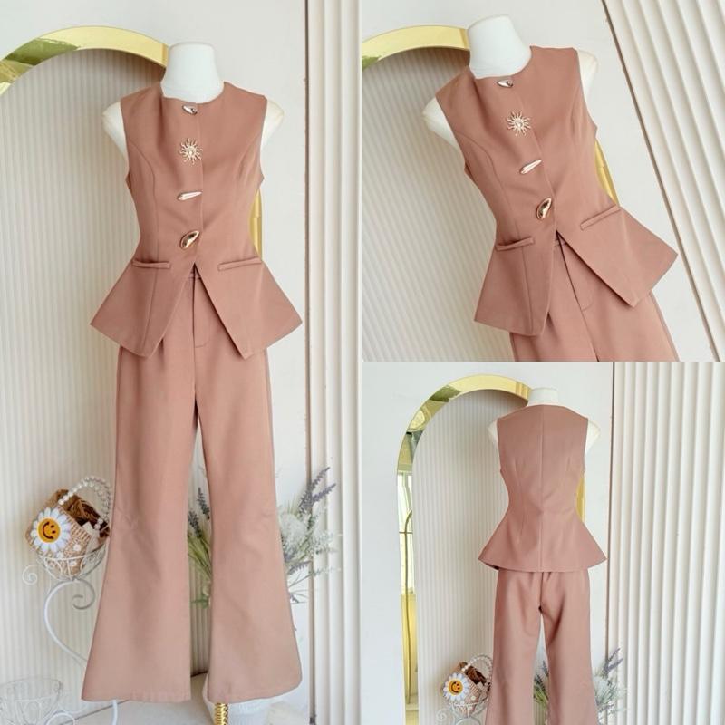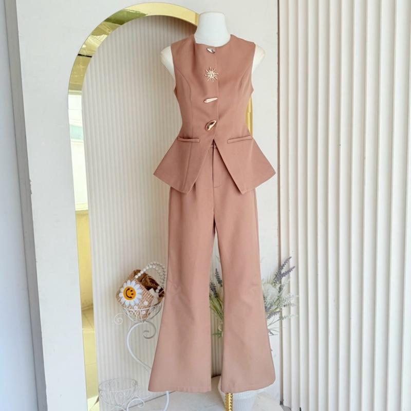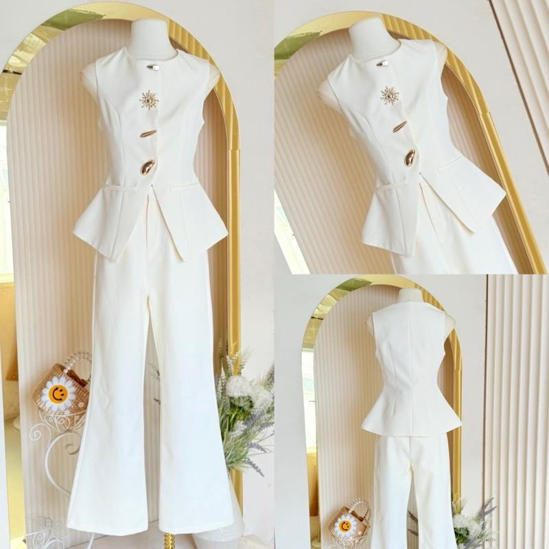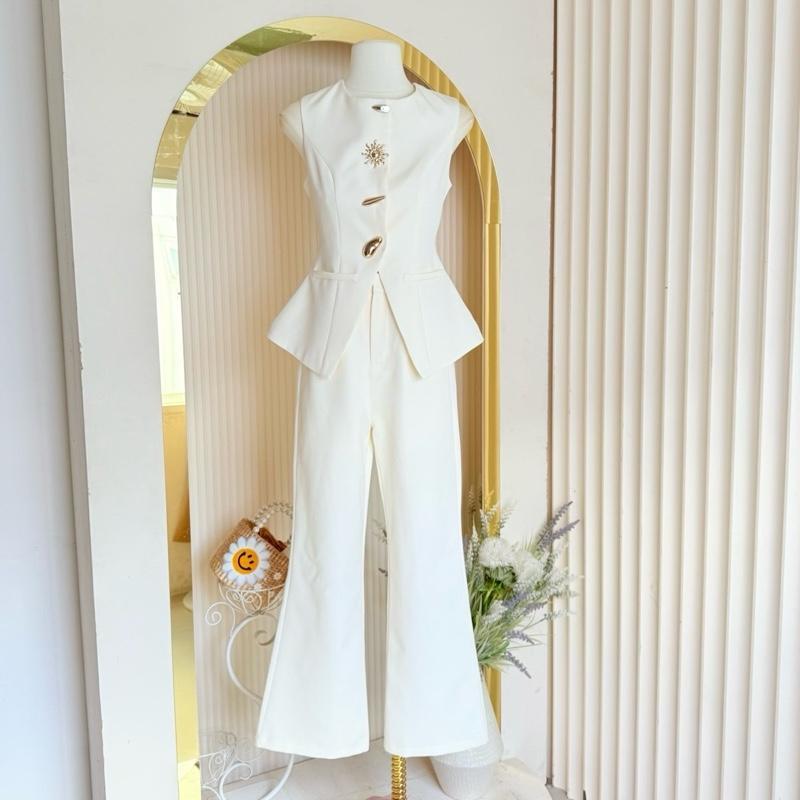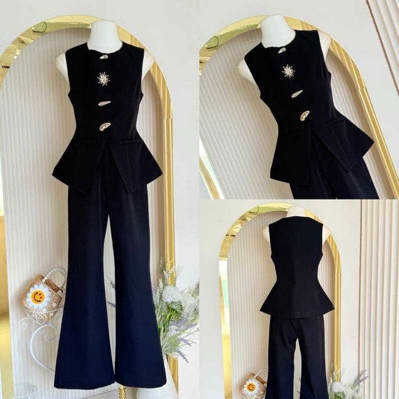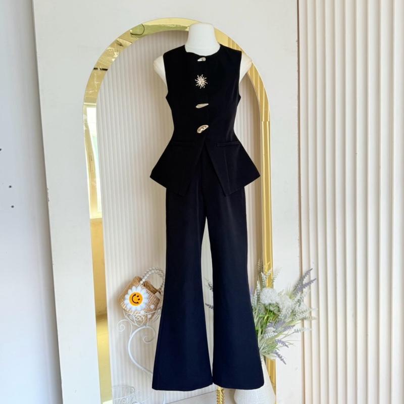 [NITTAYA] D2822 ชุดเซตเสื้อคอกลมแขนกุดดีเทลกระดุมทองกางเกงขายาว สวยหรูผู้ดี ใส่ออกงาน ดินเนอร์ คาเฟ่
