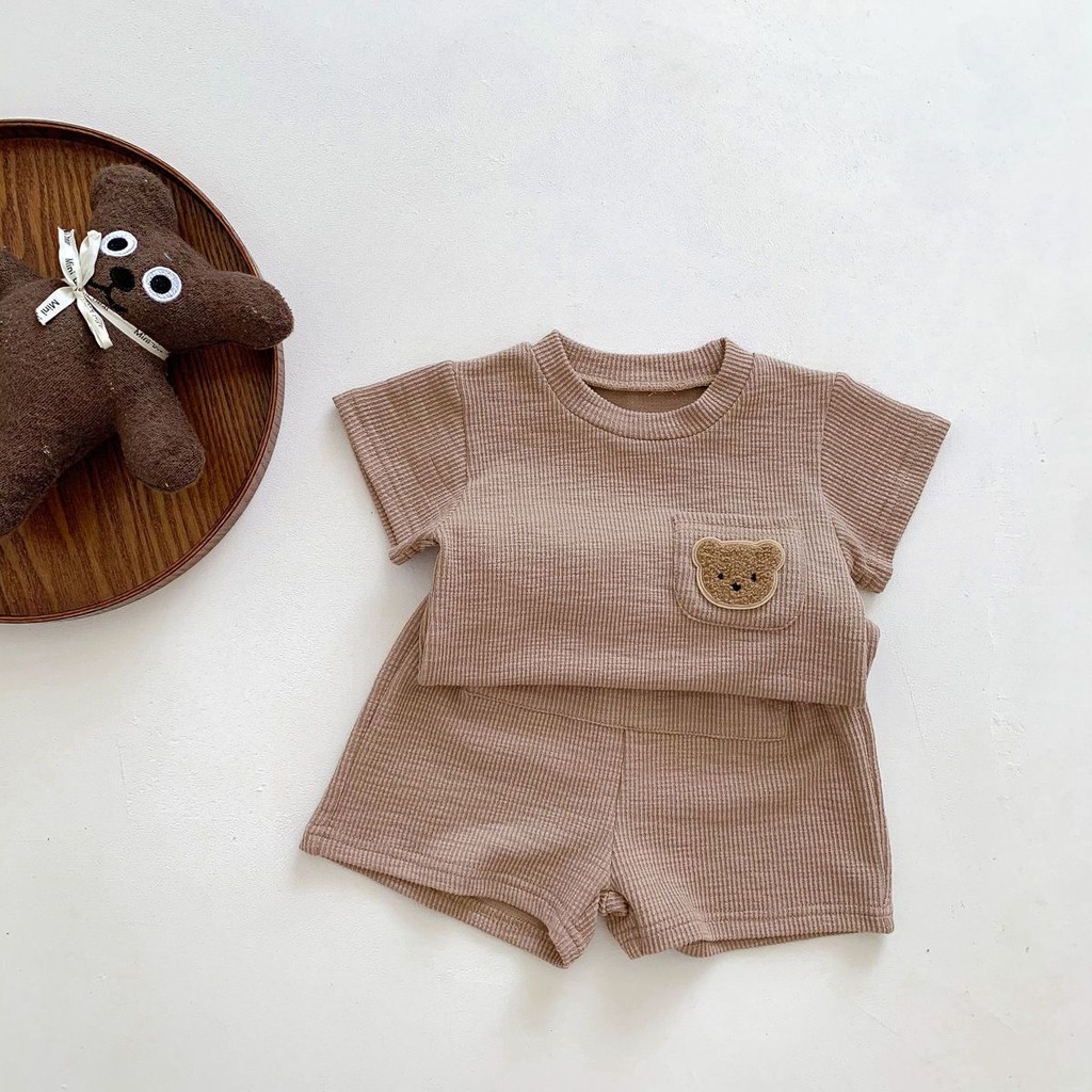 [RJ] 80-130ซม ฤดูร้อนเวอร์ชั่นเกาหลีกางเกงขาสั้นแขนสั้นชุดชายหญิงทารกวาฟเฟิลหมีสบายๆบางสไตล์เด็กชุดสองชิ้น
