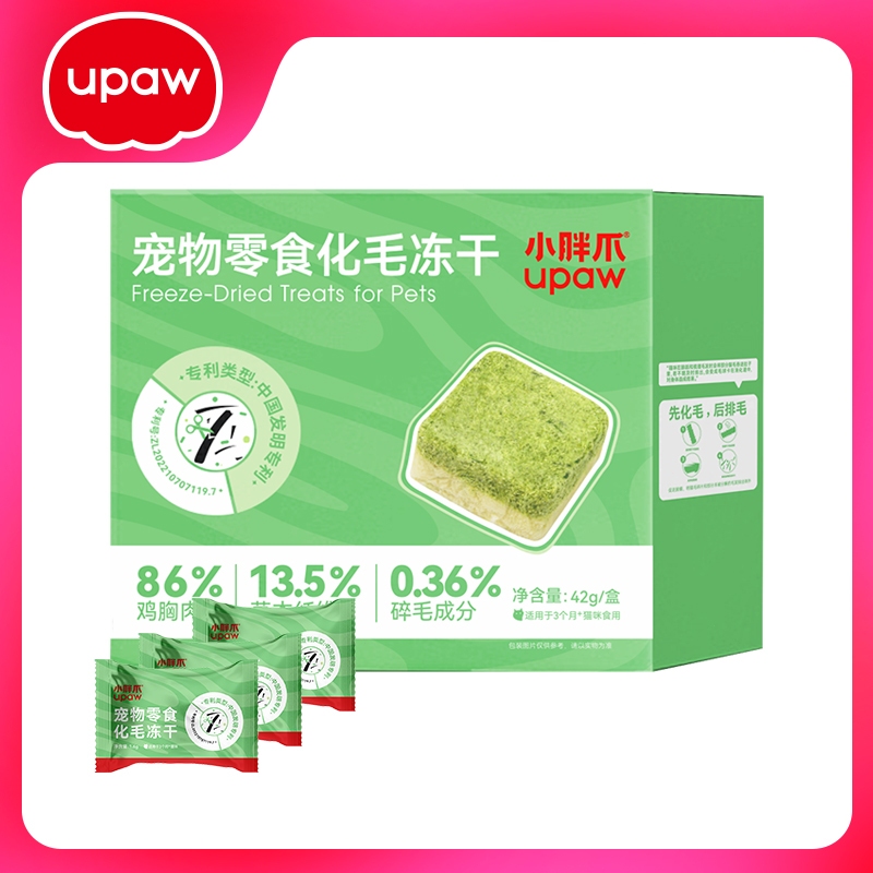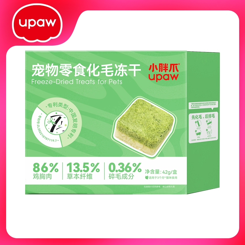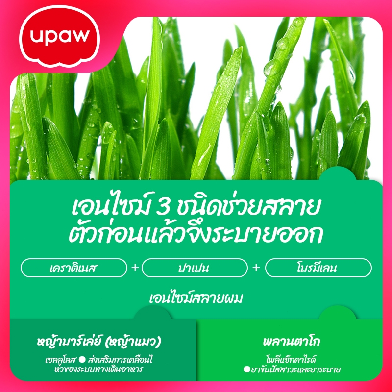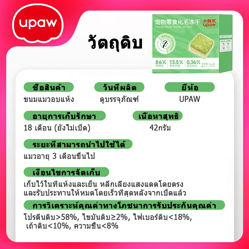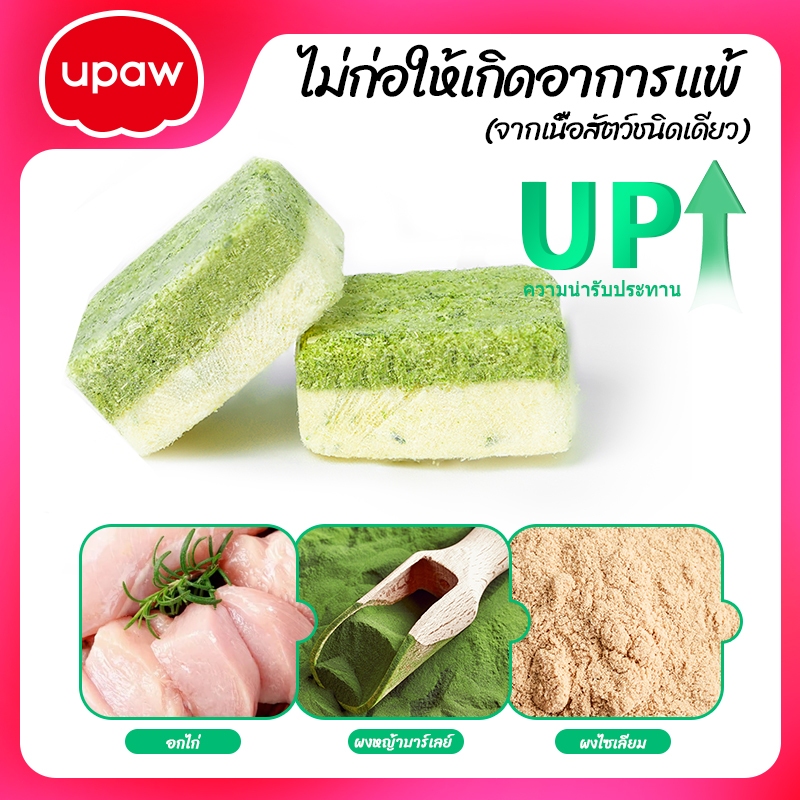 Upaw ขนมแมว หญ้าแมวฟรีซดราย ขนมแมวฟรีซดราย อกไก่ผสมต้นอ่อนข้าวสาลีฟรีซดราย ช่วยขับขนในลำคอ โปรตีนสูง 58%