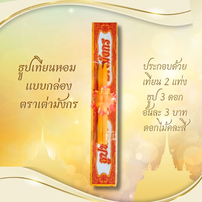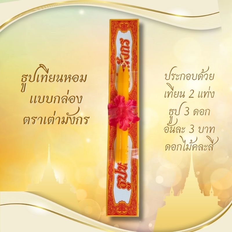 ธูปเทียนกล่อง เทียนหอม 2 เล่มและธูป 3 ดอก ตราเต่ามังกร ดอกไม้ตรงเทียนคละสี จัดสังฆทาน จัดชุดทำบุญ ใช้ในพิธีต่างๆ ถวายพระ