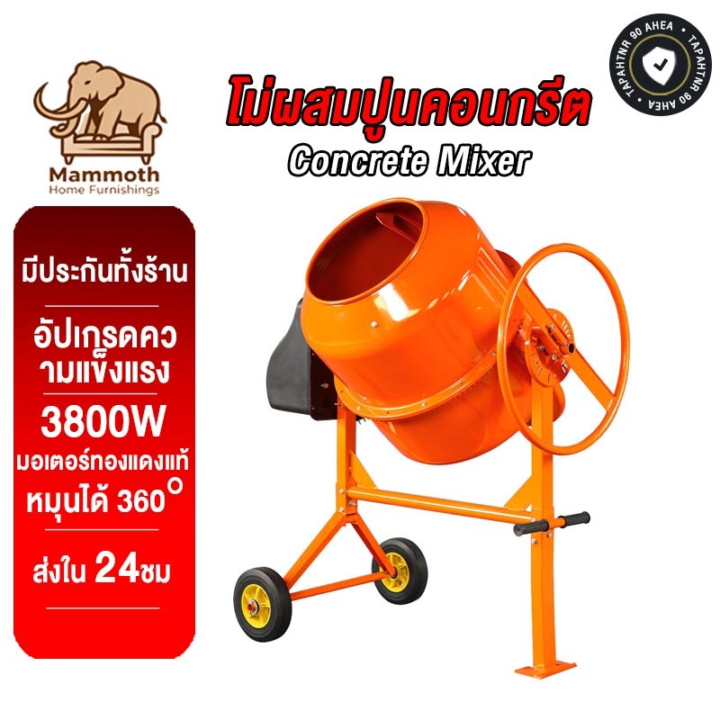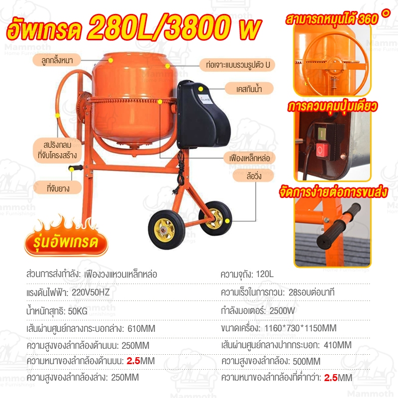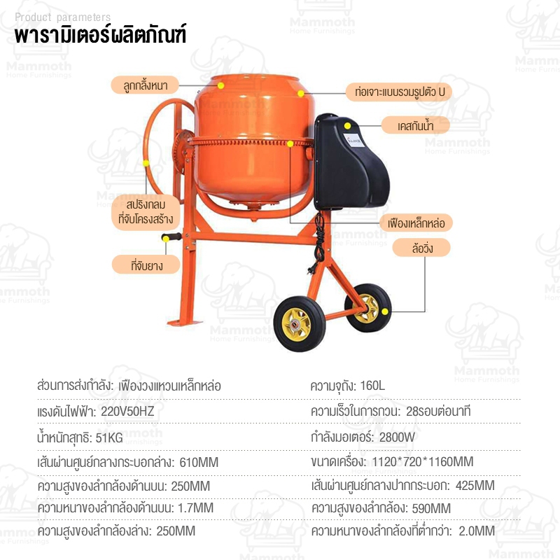 Mammoth โม่ผสมปูนคอนกรีต 120/160/240L เครื่องผสมปูนซีเมนต์ขนาดเล็กในครัวเรือนเชิงพาณิชย์พร้อมถังผสมคอนกรีต