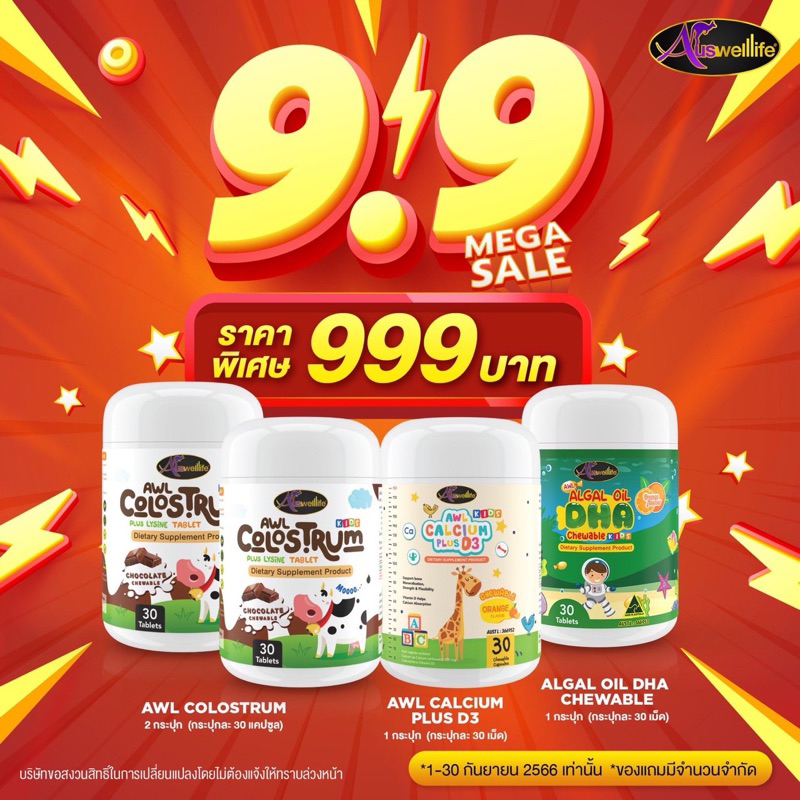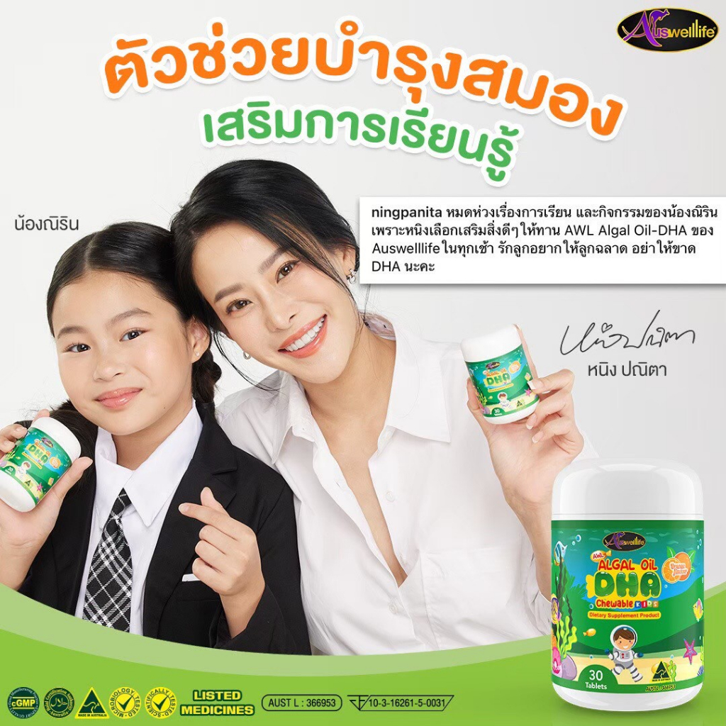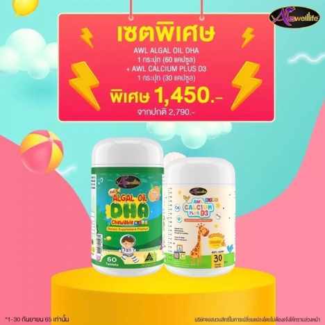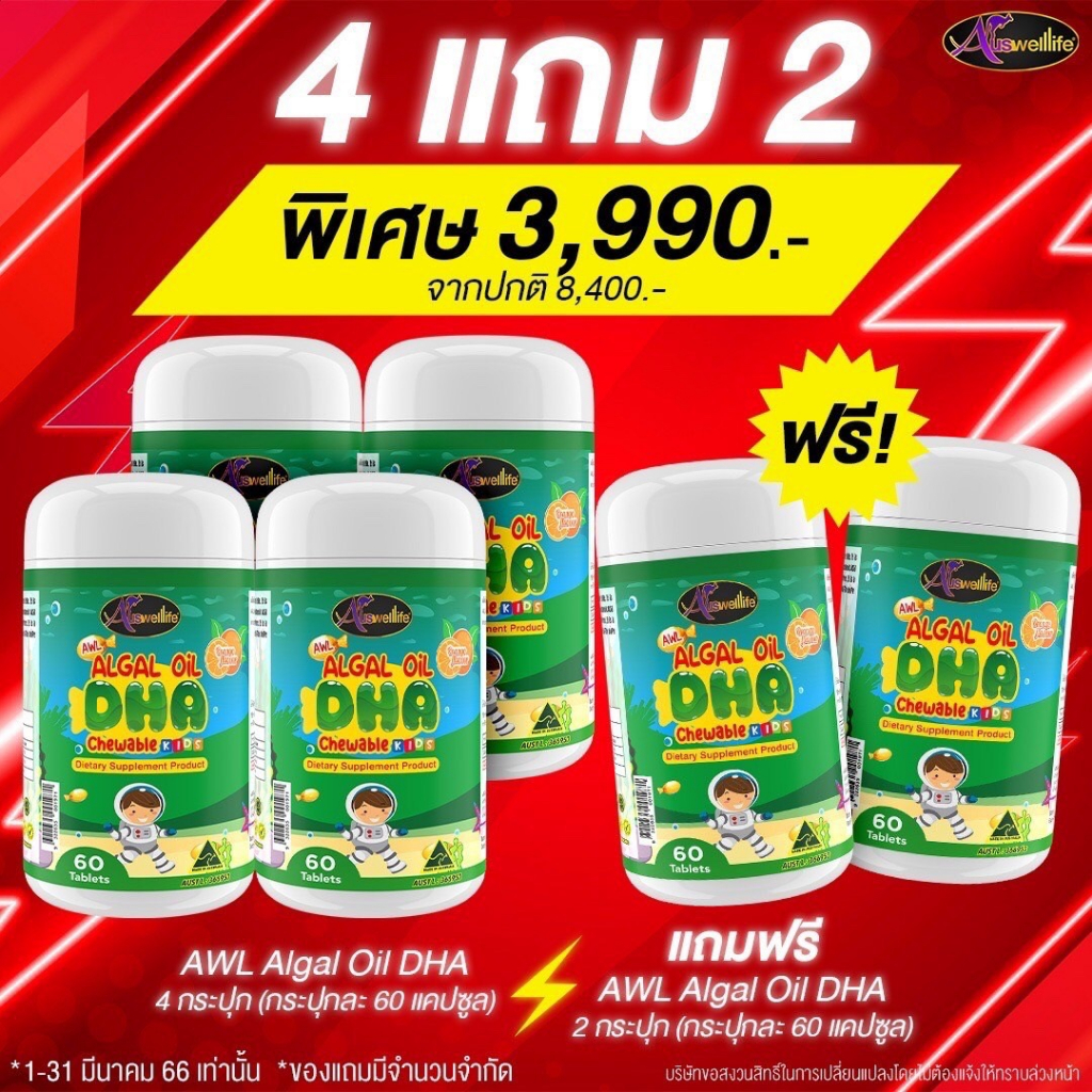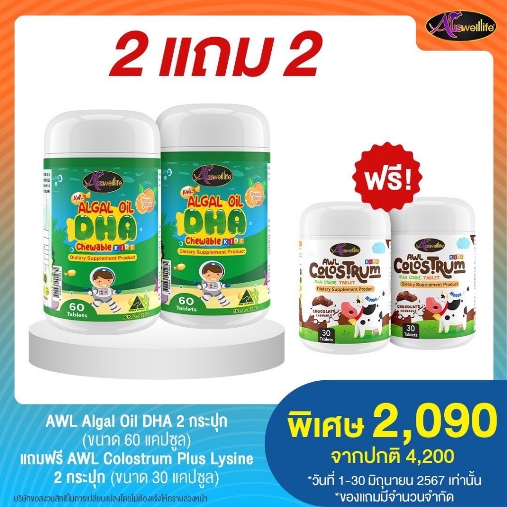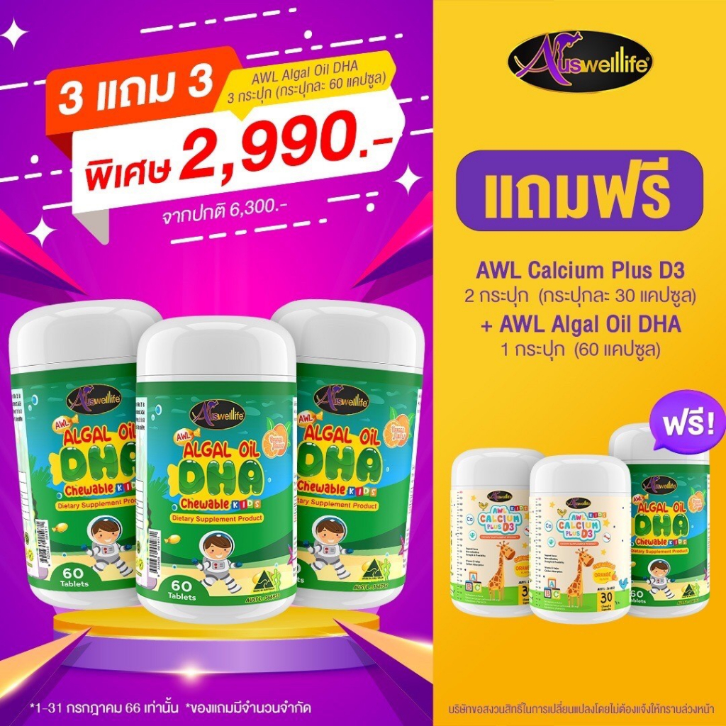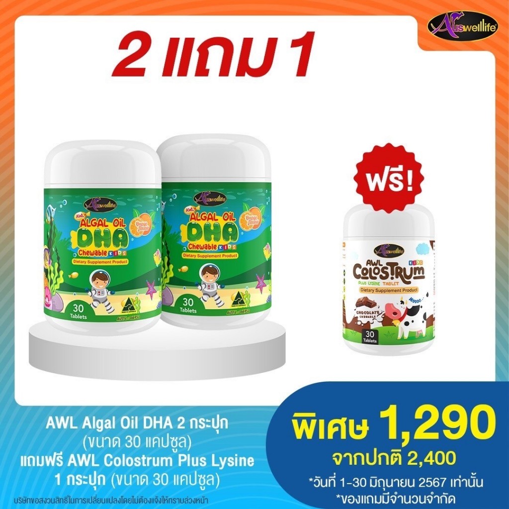 [2 แถม 1] #ส่งฟรี Algal oil DHA Auswelllife chewable 60 แคปซูล บำรุงสมอง สายตา ความจำ สมาธิ สินค้าของแท้100%