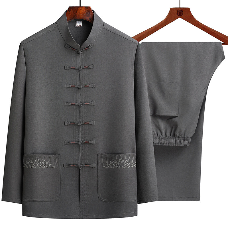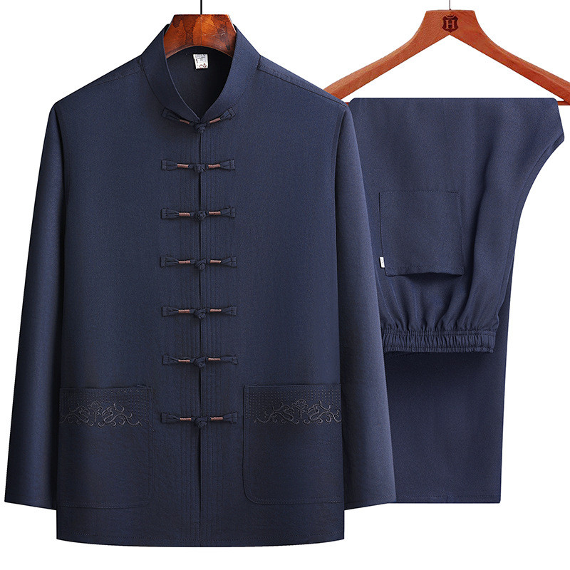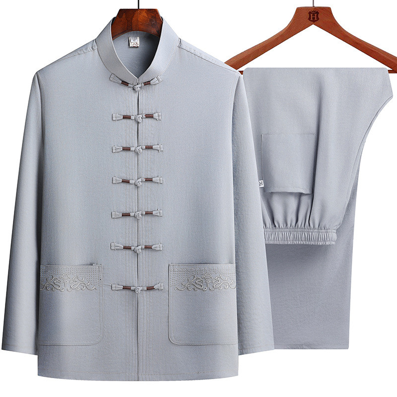 ชุดลำลองผู้ชายในสไตล์จีน เหมาะกับฤดูใบไม้ผลิและฤดูใบไม้ร่วง กับเสื้อแขนยาวเบาๆ สำหรับฤดูร้อน