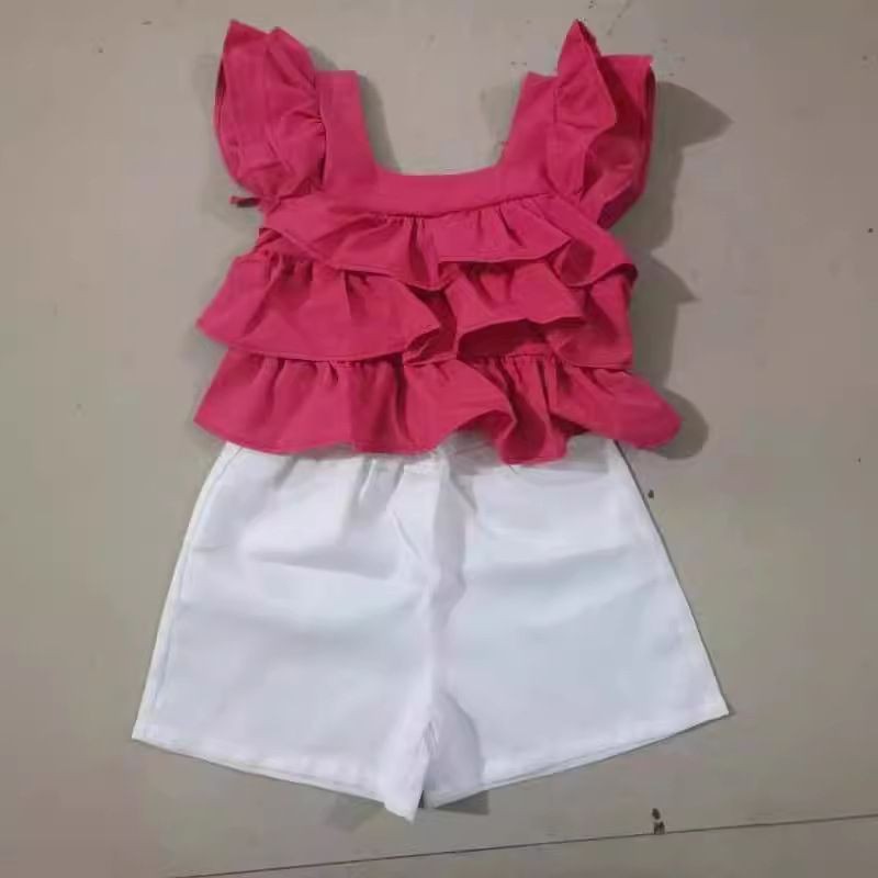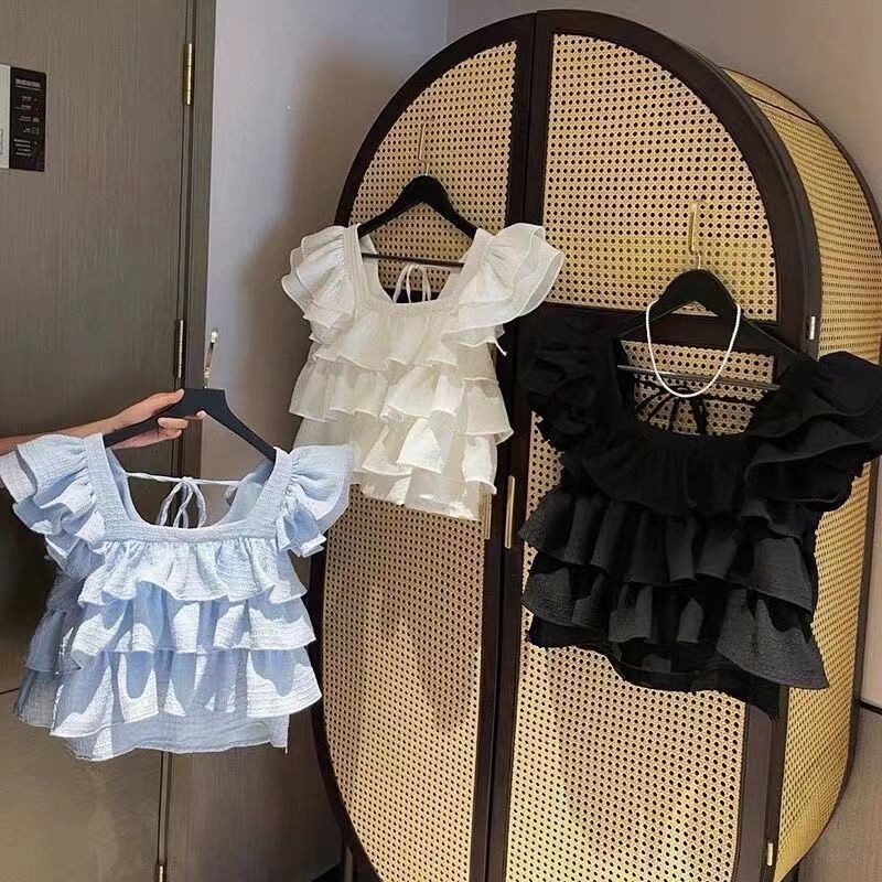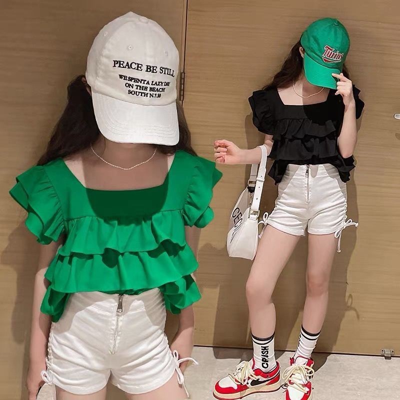 สาวฤดูร้อนสไตล์ใหม่เสื้อกั๊กเวอร์ชั่นเกาหลีแฟชั่นขอบเชื้อราเค้กบินแขนเสื้อกลางเด็กใหญ่สีทึบเสื้อด้านบน
