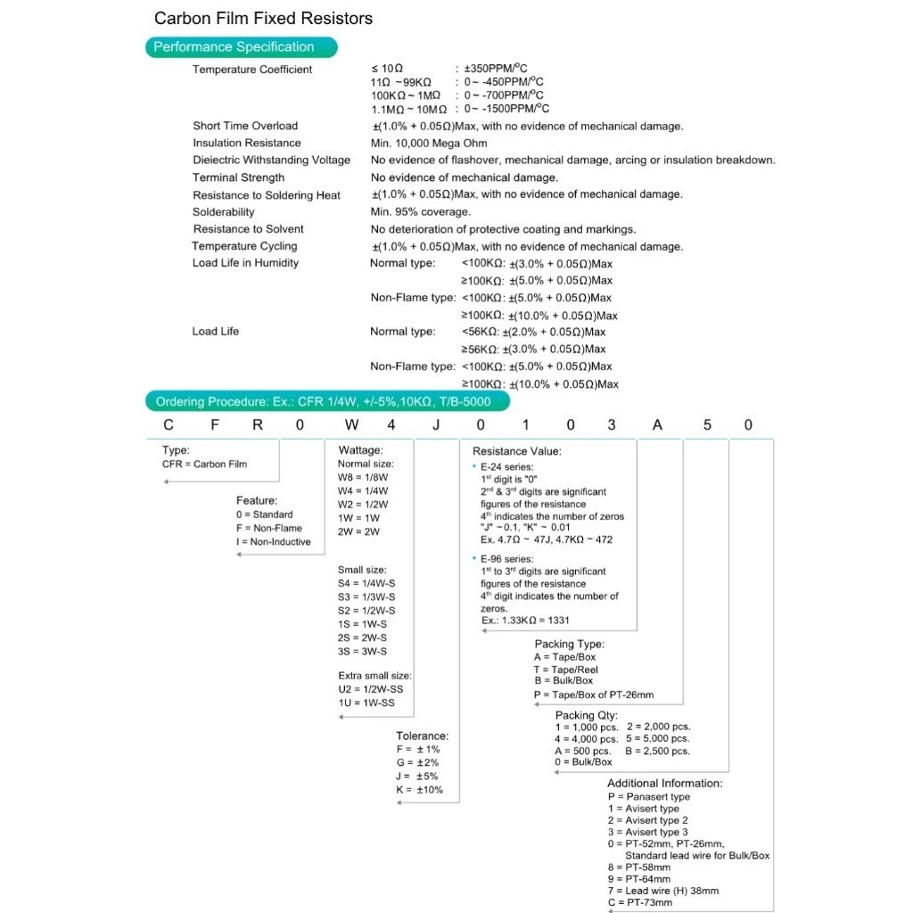 Carbon Film Resistor ตัวต้านทานฟิล์มคาร์บอน 1/2W (0.5W) 5% Ohm 10R ~ 910R 1k แพ็ก 10 ตัว แจ้งค่าที่ต้องการทางแชทได้เลย