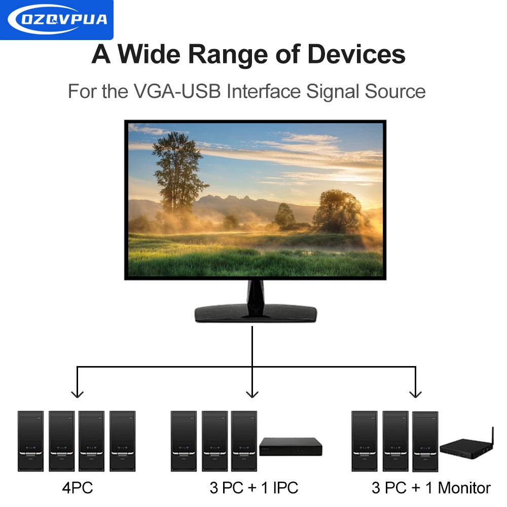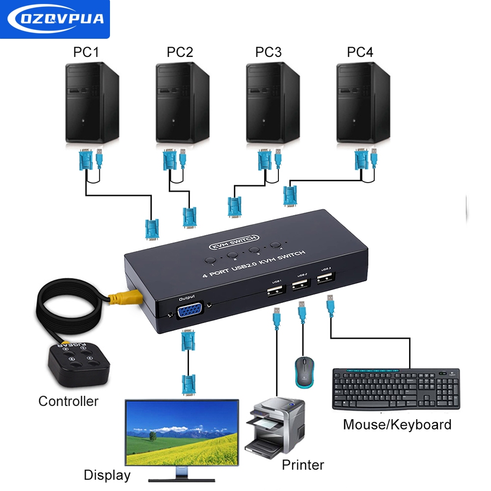 สวิตช์ VGA KVM 4 พอร์ตพร้อมรองรับระยะไกลไร้สาย, สวิตช์ OZQVPUA KVM VGA พร้อมสาย 4 KVM สําหรับคอมพิวเตอร์ 4 PC Sharing 1 จอภาพ