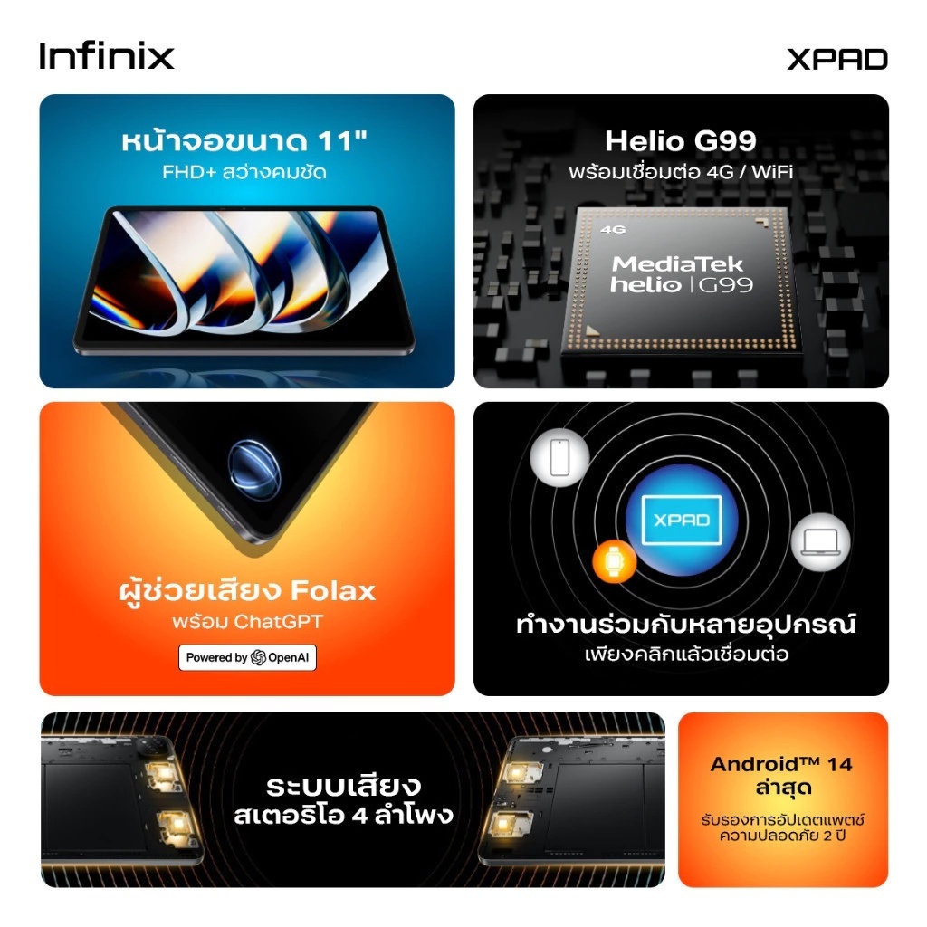 Infinix XPAD แท็บเล็ตหน้าจอใหญ่ 11" FHD+ จอสว่างคมชัด ชิปเซ็ตประสิทธิภelio G99 เชื่อมต่อ 4G/WiFi