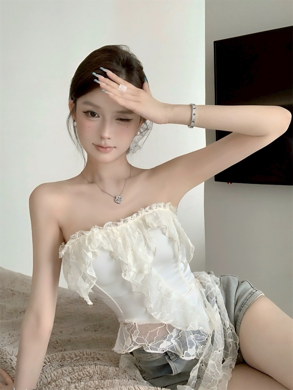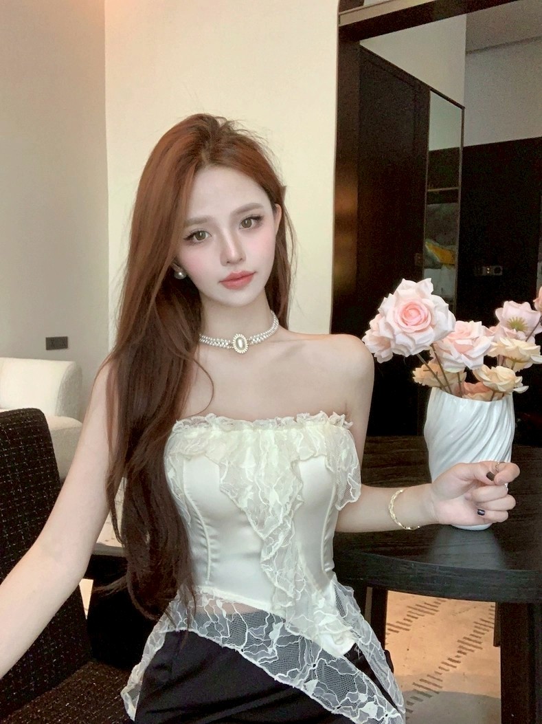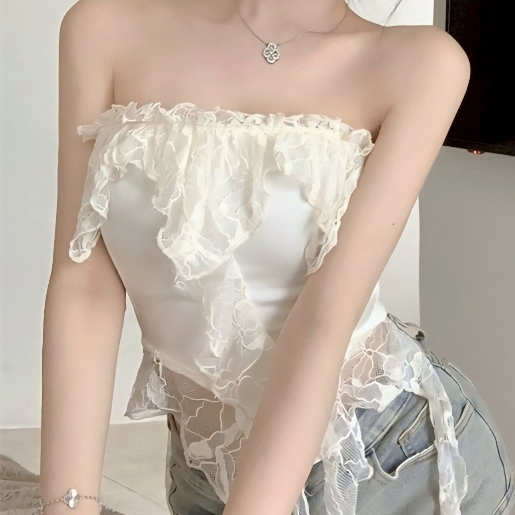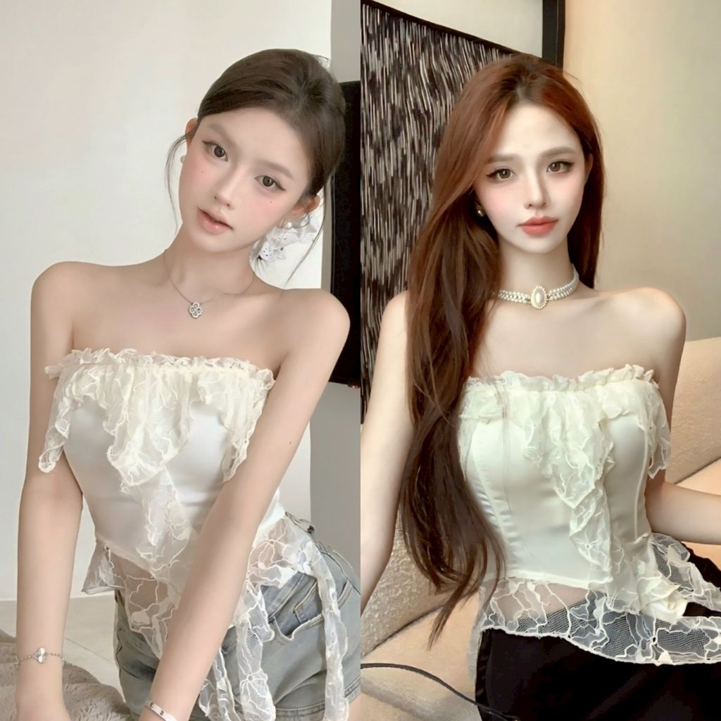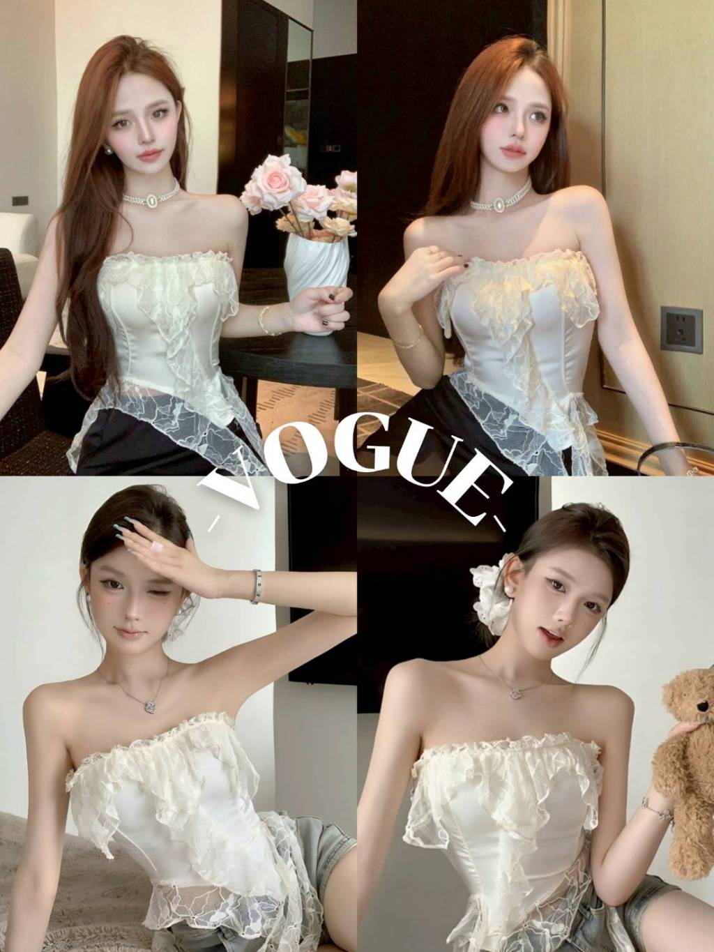 Vogue🌟พร้อมส่ง🌟 เสื้อเกาะอก แต่งซีทรู ปลายแต่ง มีฟองน้ำ (FY9079)
