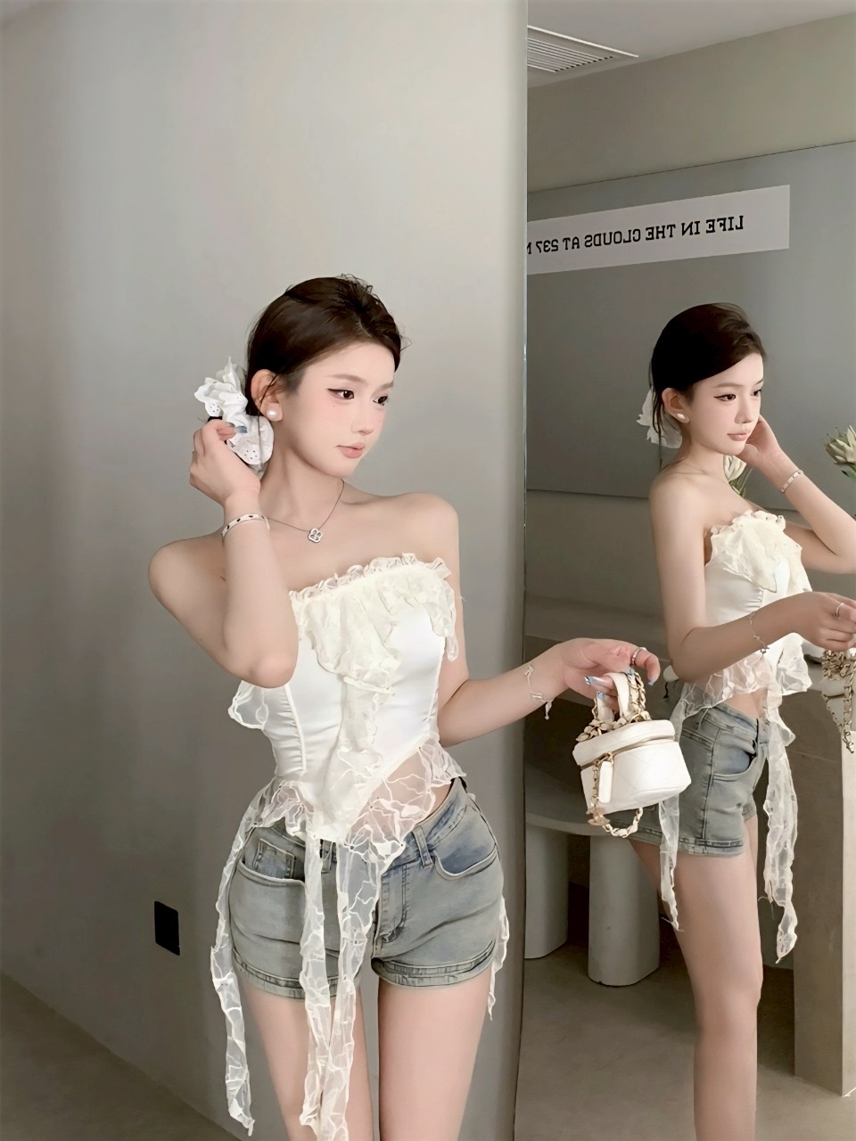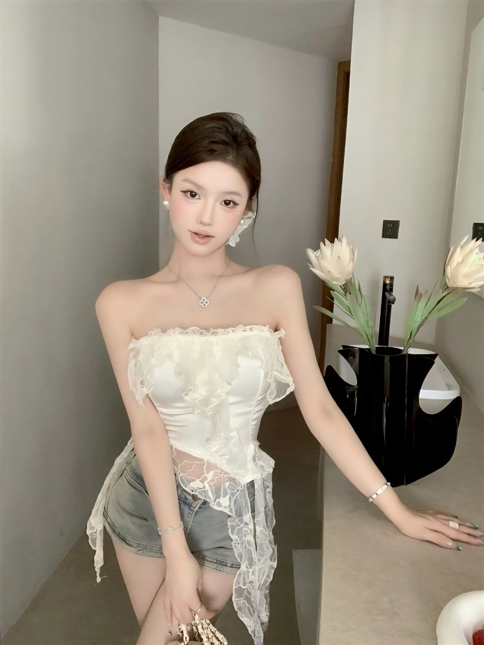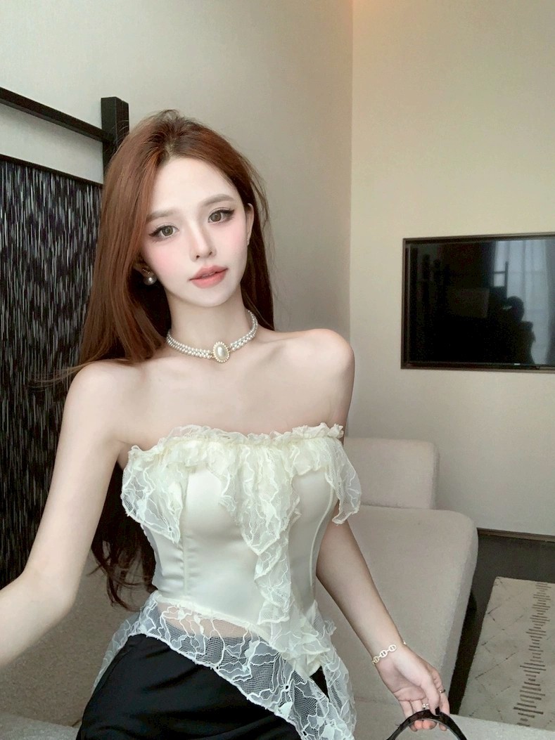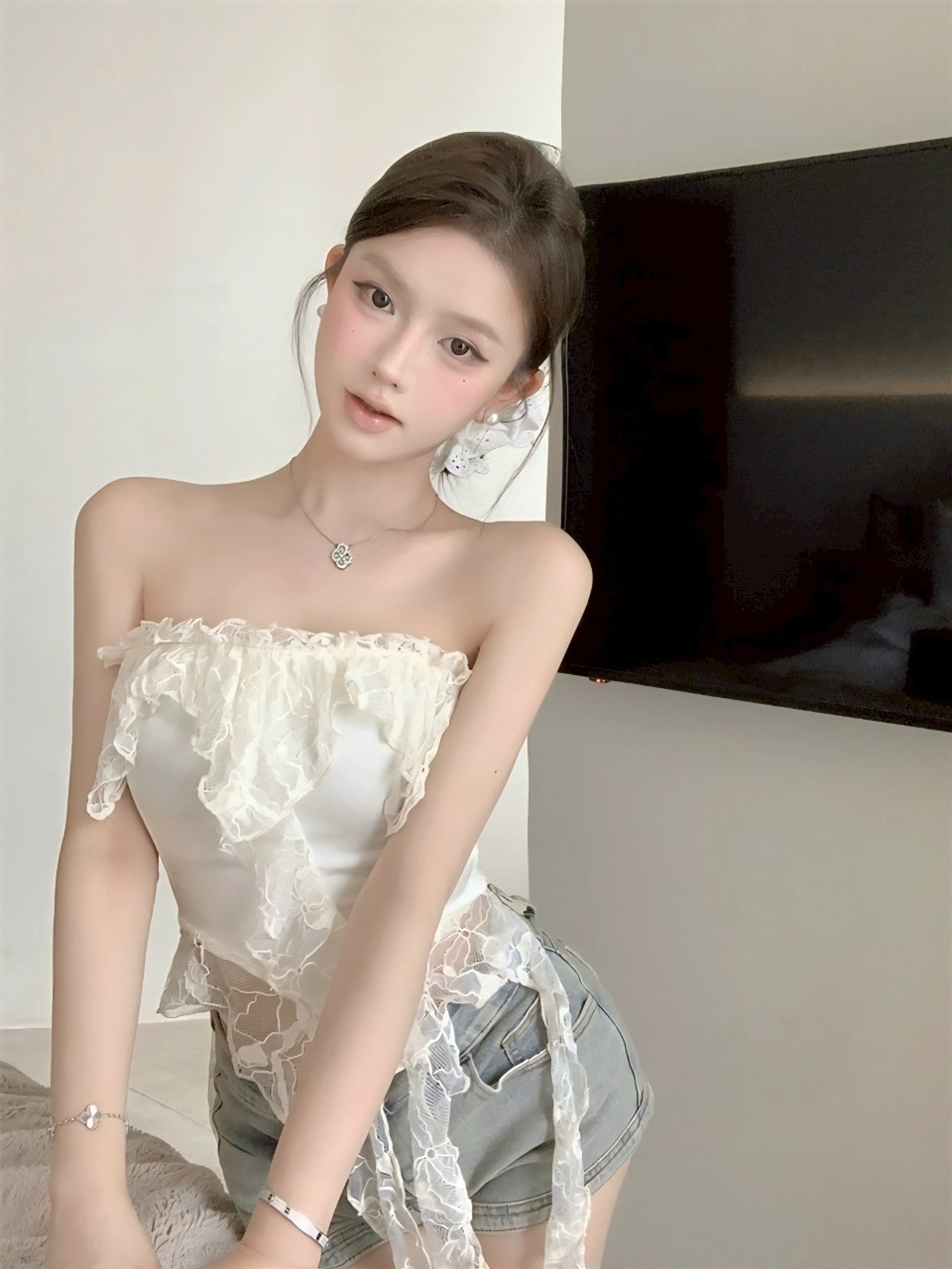 Vogue🌟พร้อมส่ง🌟 เสื้อเกาะอก แต่งซีทรู ปลายแต่ง มีฟองน้ำ (FY9079)