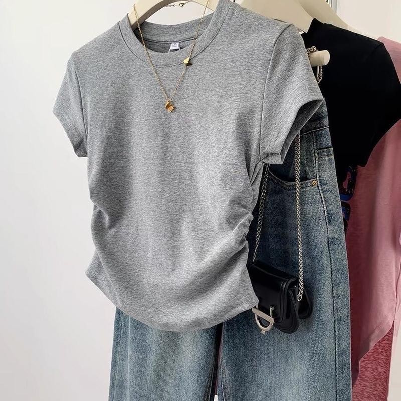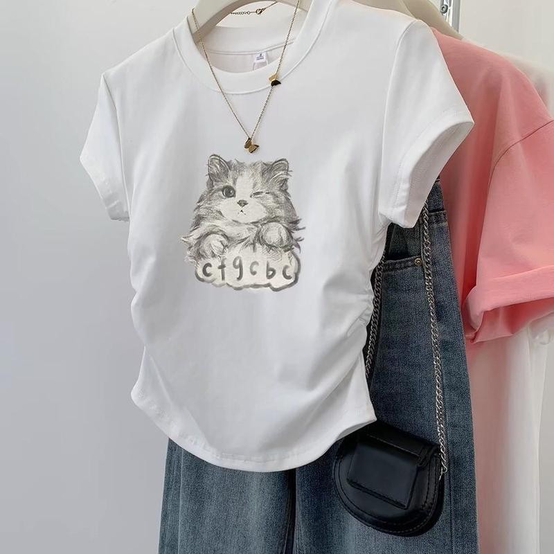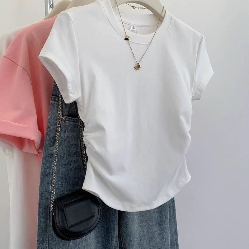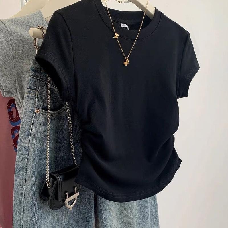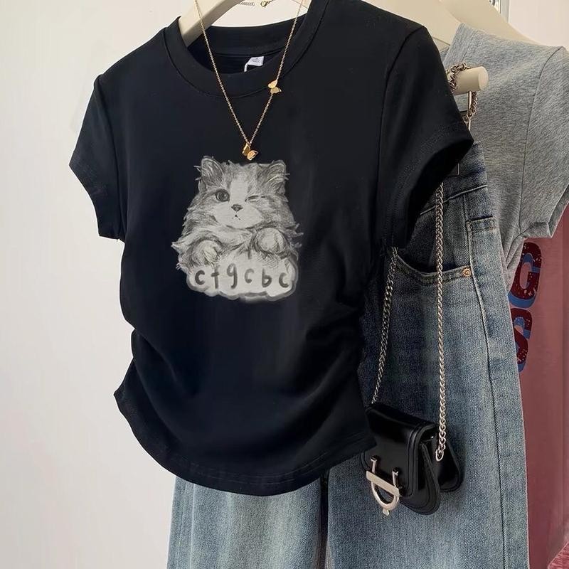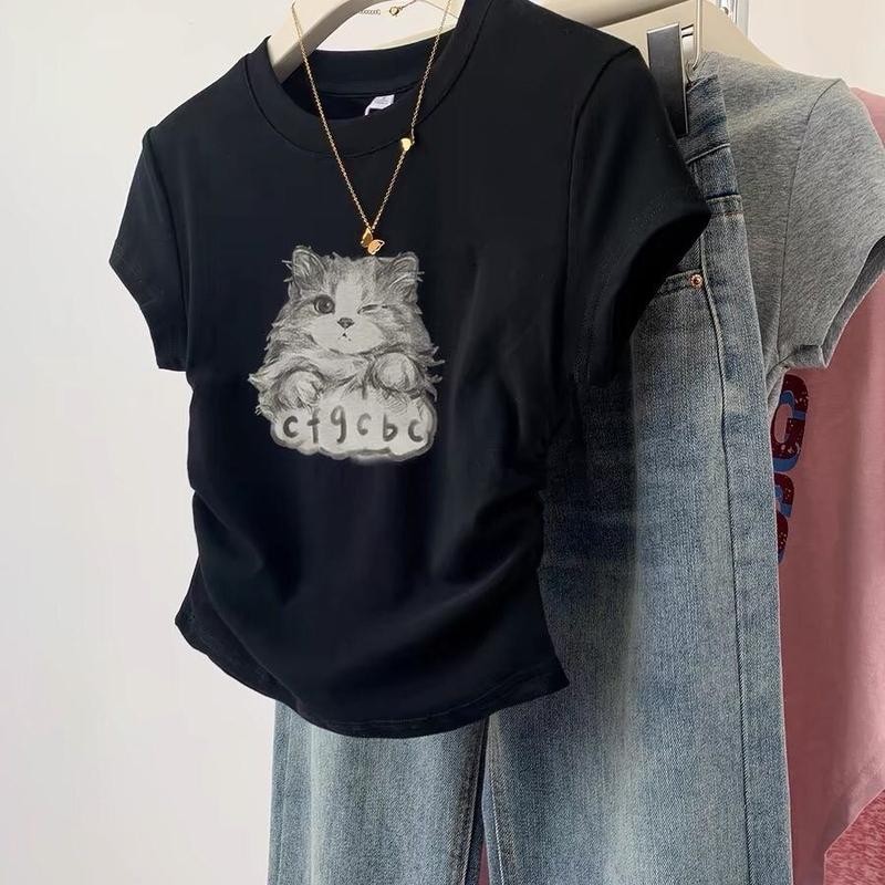เสื้อยืดไหล่แมว สีดำ แขนสั้น สำหรับผู้หญิง ฤดูร้อน ดีไซน์ใหม่ ดีไซน์เก๋ ทรงสลิมฟิต เสื้อครอป เหมาะสำหรับผู้หญิง