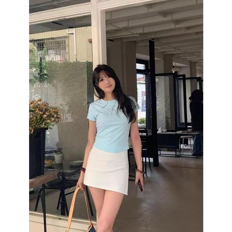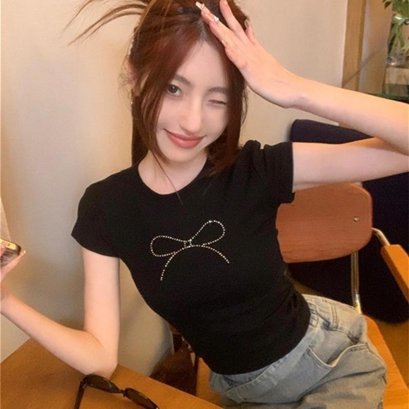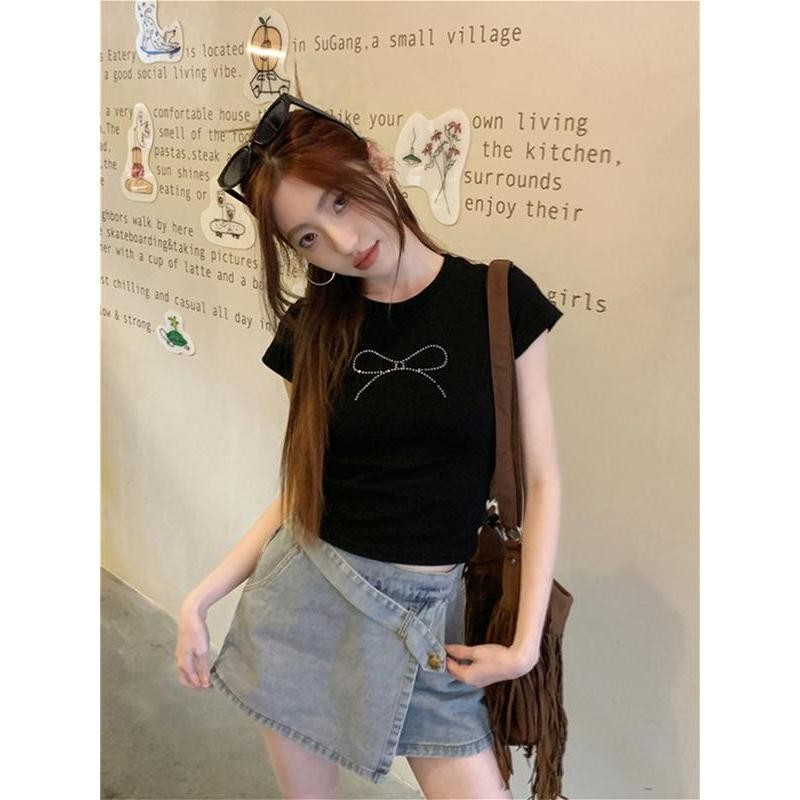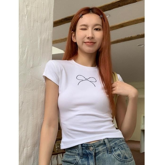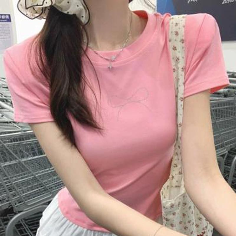 เสื้อยืดผู้หญิง เสื้อยืดสวยๆผู้หญิง เสื้อยืดครอป เสื้อยืดสั้นผูกโบว์สไตล์สาวฮอต เสื้อคอกลมแฟชั่นใหม่สำหรับฤดูร้อน