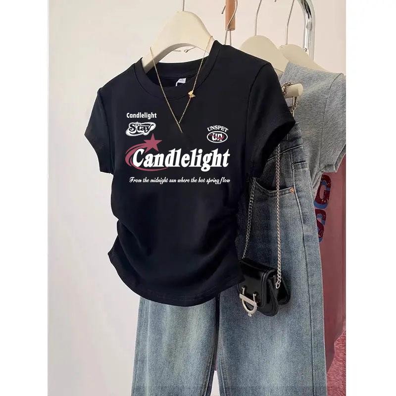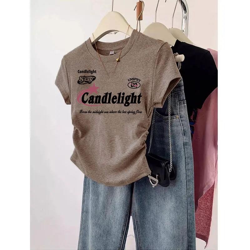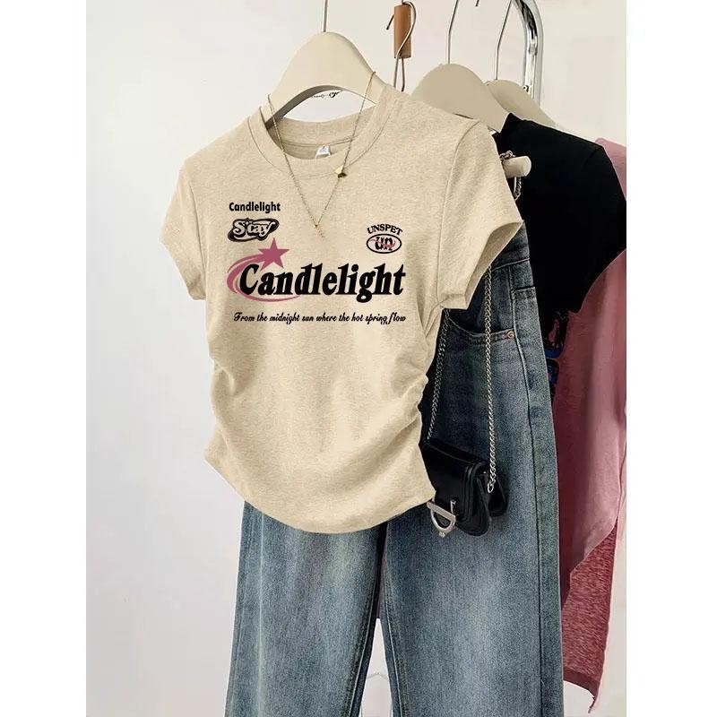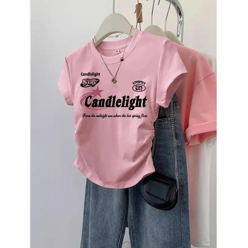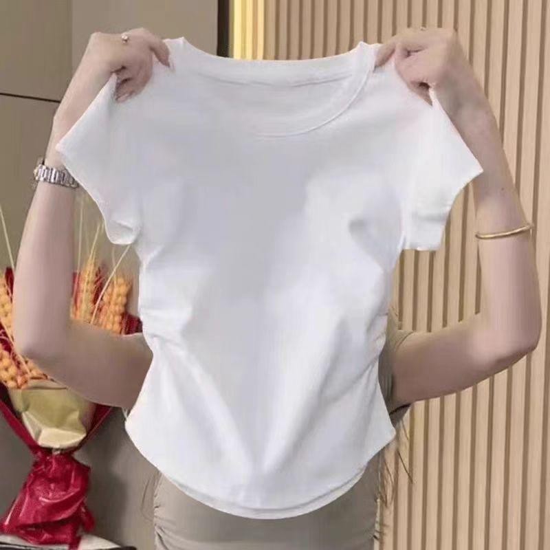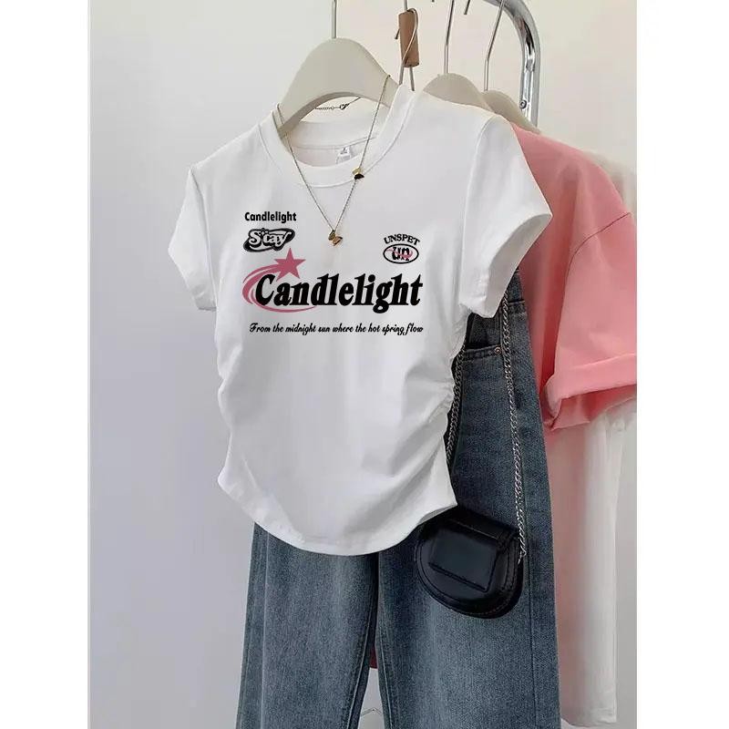 สือยืดแฟชั่นเกาหลีแขนสั้น เสือรัดรูปสีขาว เสือยิดผู้หญิงน่ารักๆ คอกลมู เสือยืดผู้หญิง พิมพ์ลาย สไตล์ลำลอง คุณผู้หญิง