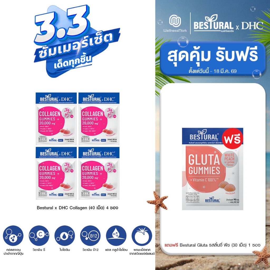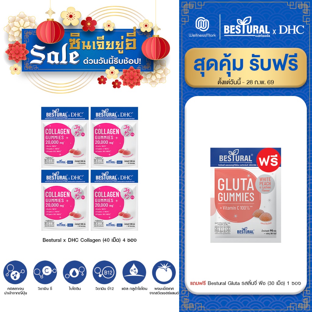 DHC X Bestural คอลลาเจน (สูตรไม่เติมน้ำตาล) (40 เม็ด) 4 ซอง + แถมฟรี 1 ซอง