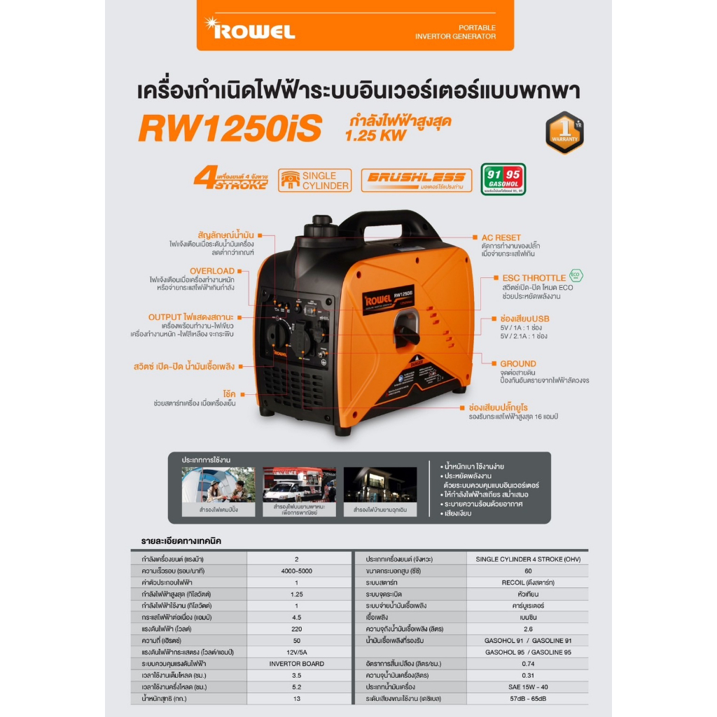 🔥รุ่นใหม่ พร้อมส่ง🔥 เครื่องปั่นไฟ เสียงเงียบ ROWEL RW1250iS 1.25KW. INVERTER เครื่องกำเนิดไฟฟ้า
