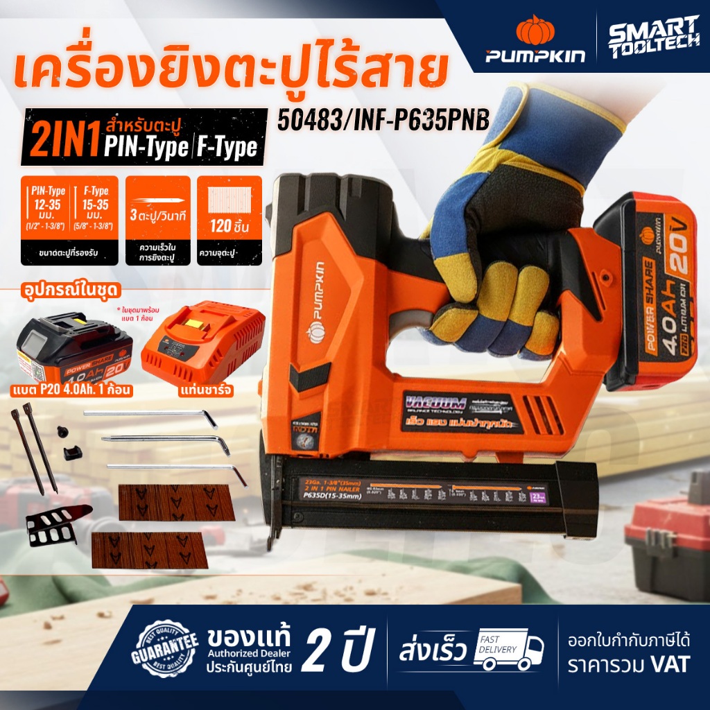 🔥รุ่นใหม่ปี 2026 ส่งด่วน🔥 เครื่องยิงตะปูไร้สาย 20V P635D 2-IN-1 Pumpkin 50483 ปืนยิงตะปู ที่ยิงตะปู