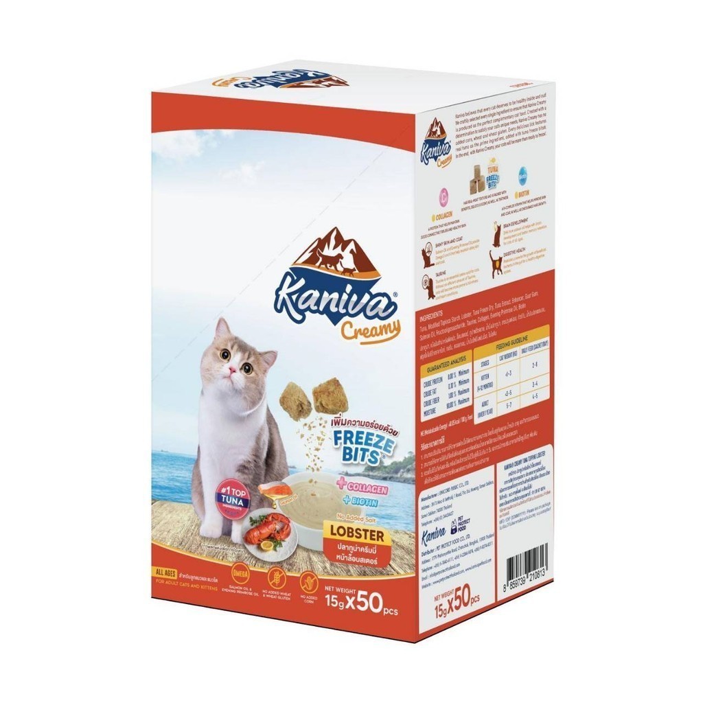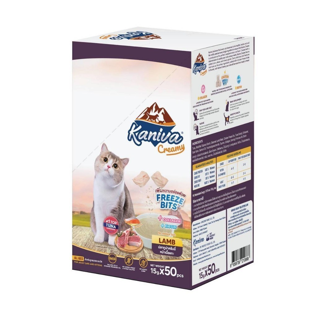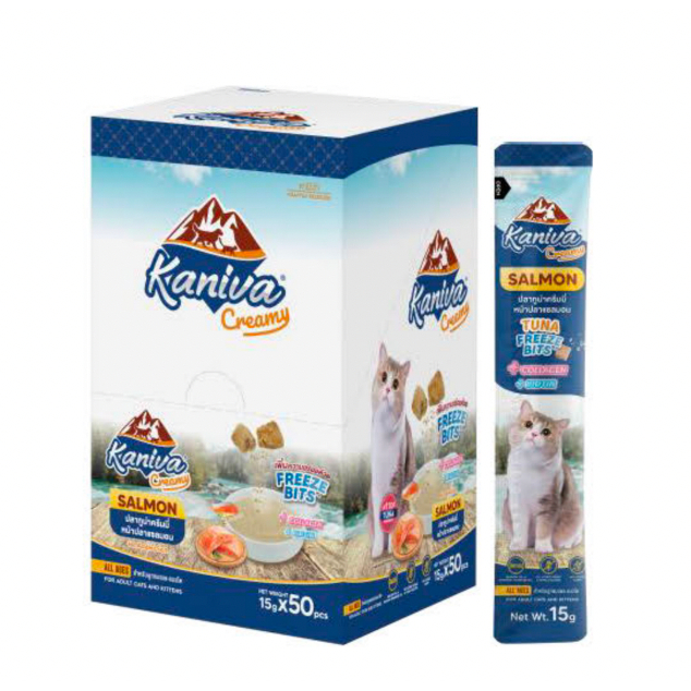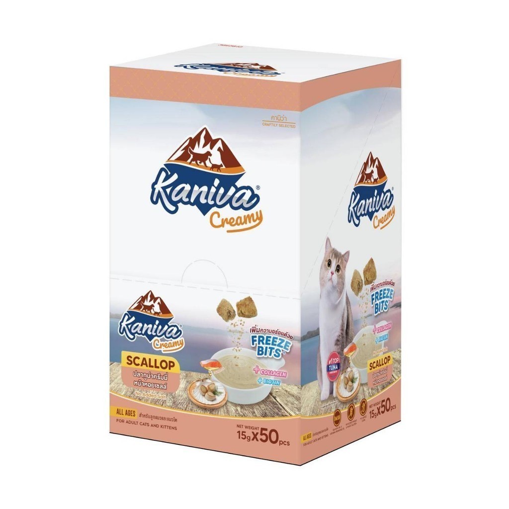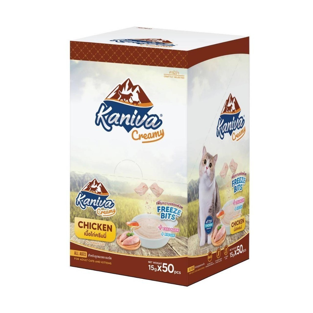 Kaniva ขนมแมวเลียครีมมี่ ยกกล่อง 50 ชิ้น แมวเลียคานิวา ไบโอติน บำรุงขนผิวหนัง มีฟรีชดราย