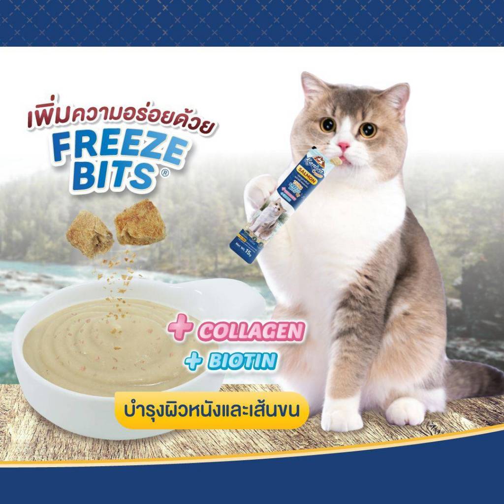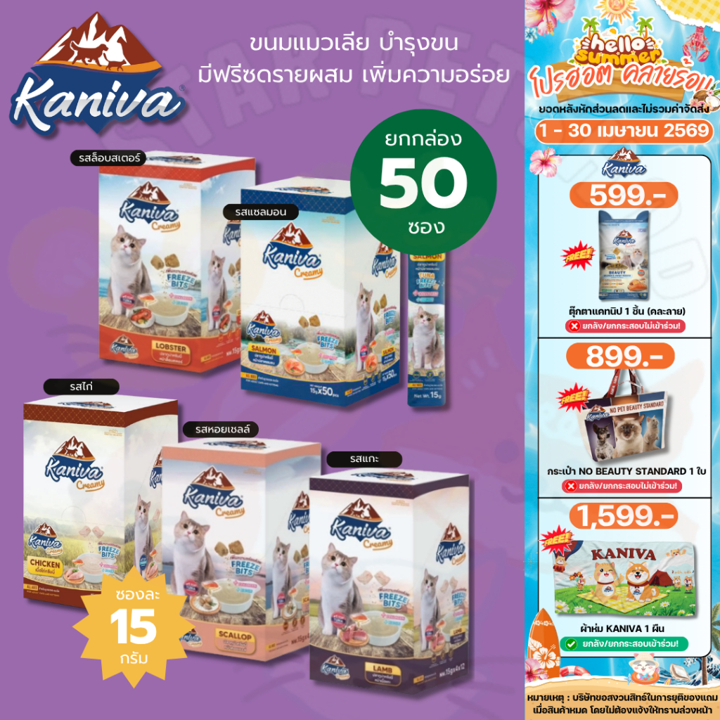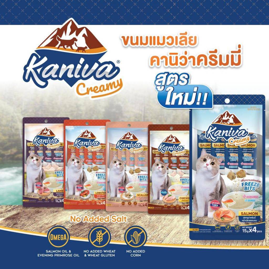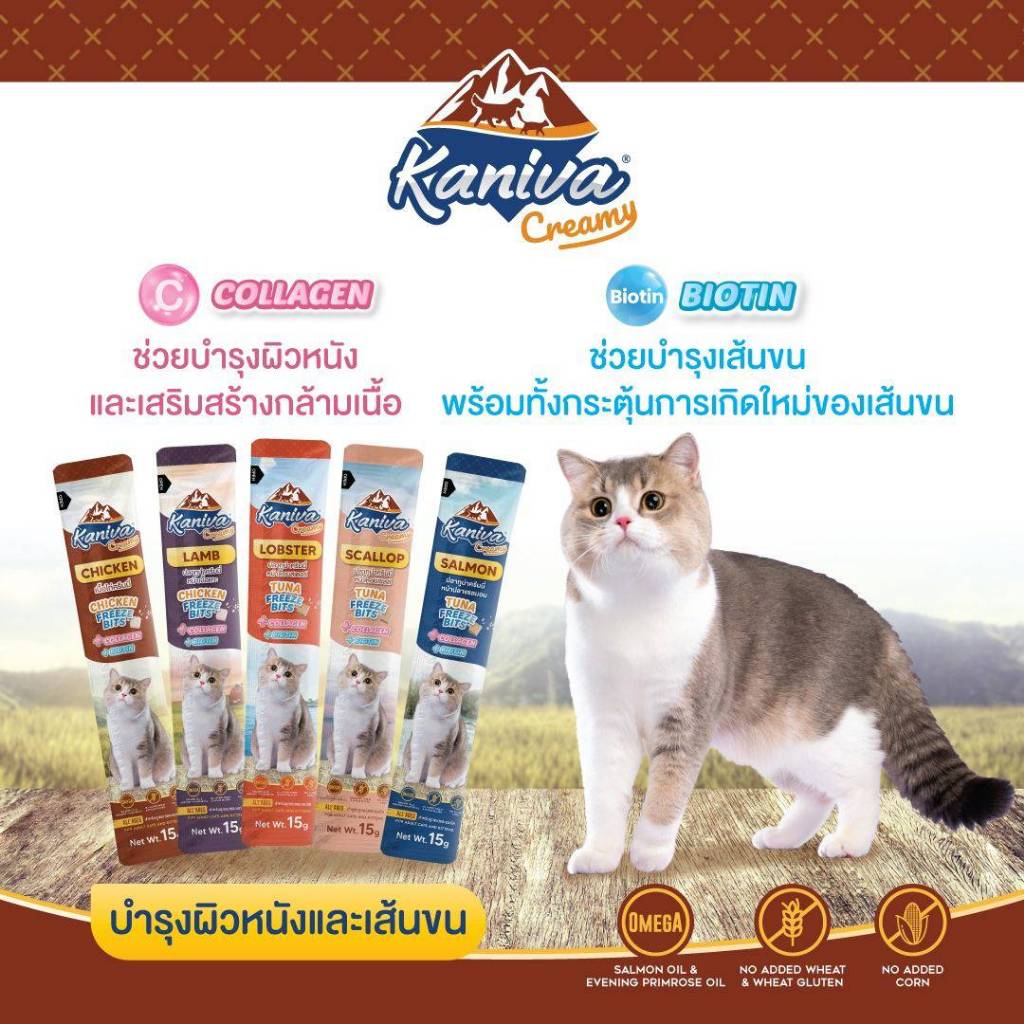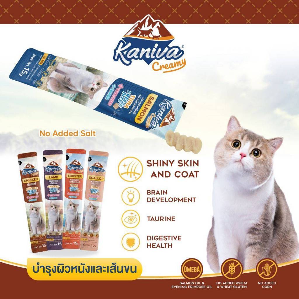 Kaniva ขนมแมวเลียครีมมี่ ยกกล่อง 50 ชิ้น แมวเลียคานิวา ไบโอติน บำรุงขนผิวหนัง มีฟรีชดราย