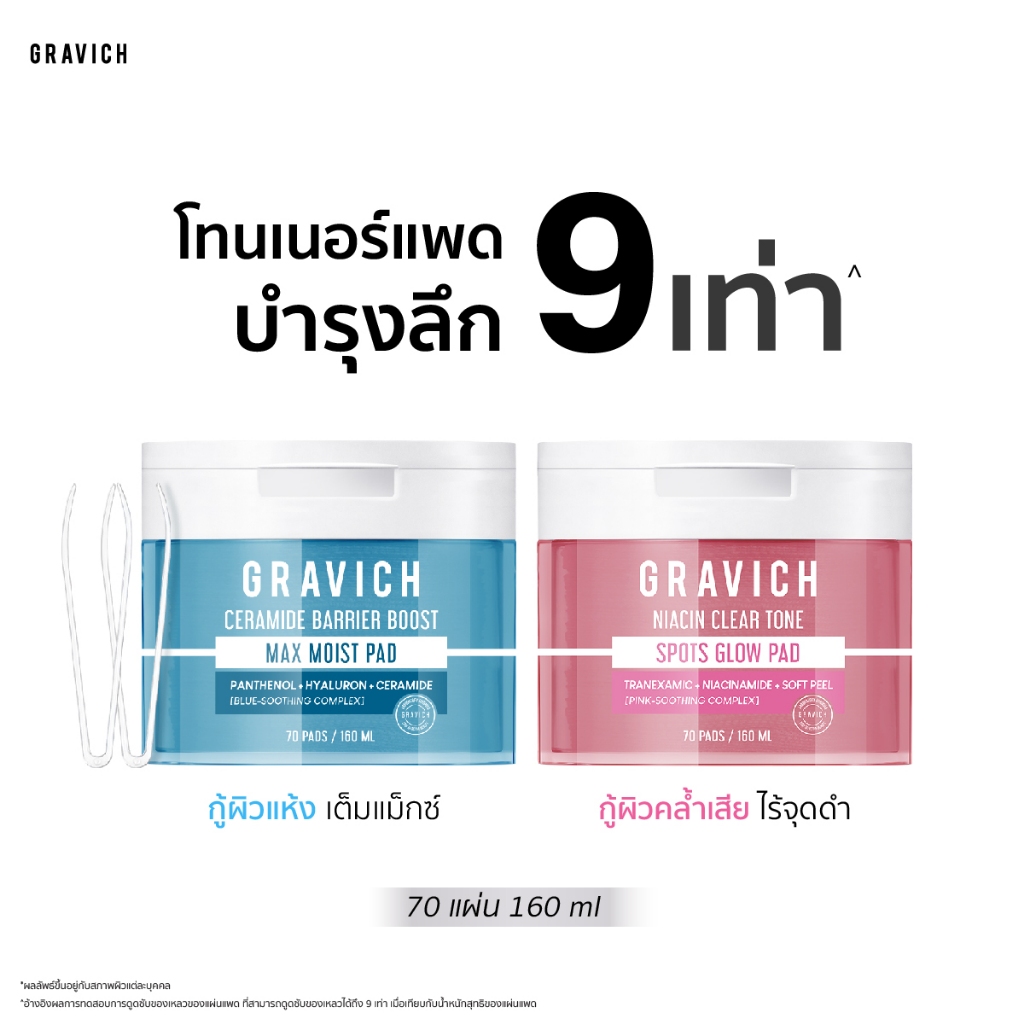 [ ใหม่!! Toner Pad ] Gravich Ceramide Barrier Boost Max Moist / Niacin Clear Tone Spots Glow โทนเนอร์แพด 70แผ่น