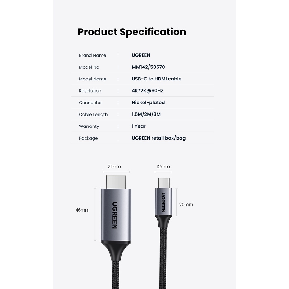 UGREEN Original 4k 60HZ Type C เป็นสาย HDMI Thunderbolt 3 อะแดปเตอร์ Type C เป็นสาย HDMI