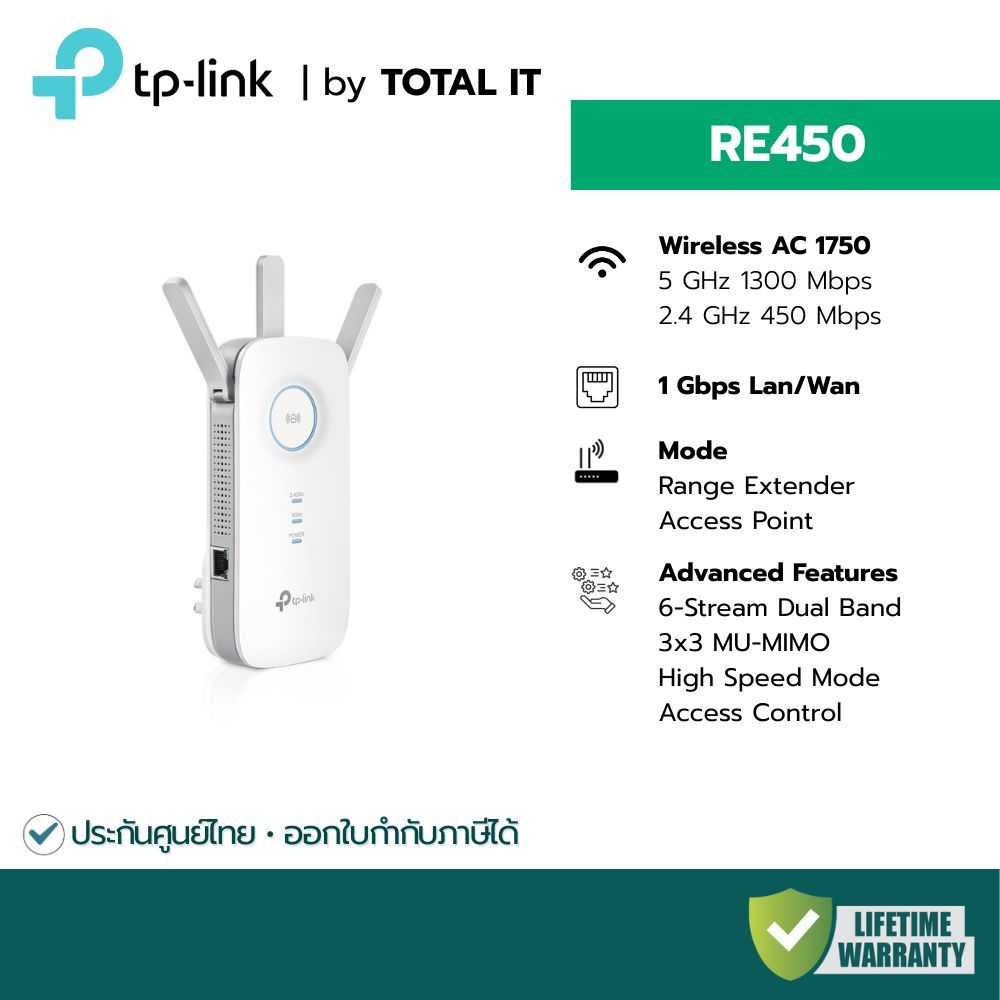 TP-Link RE450 ตัวขยายสัญญาณ WiFi AC1750 | พอร์ต Gigabit | Range Extender | ตัวดูดเน็ต | แก้จุดอับ