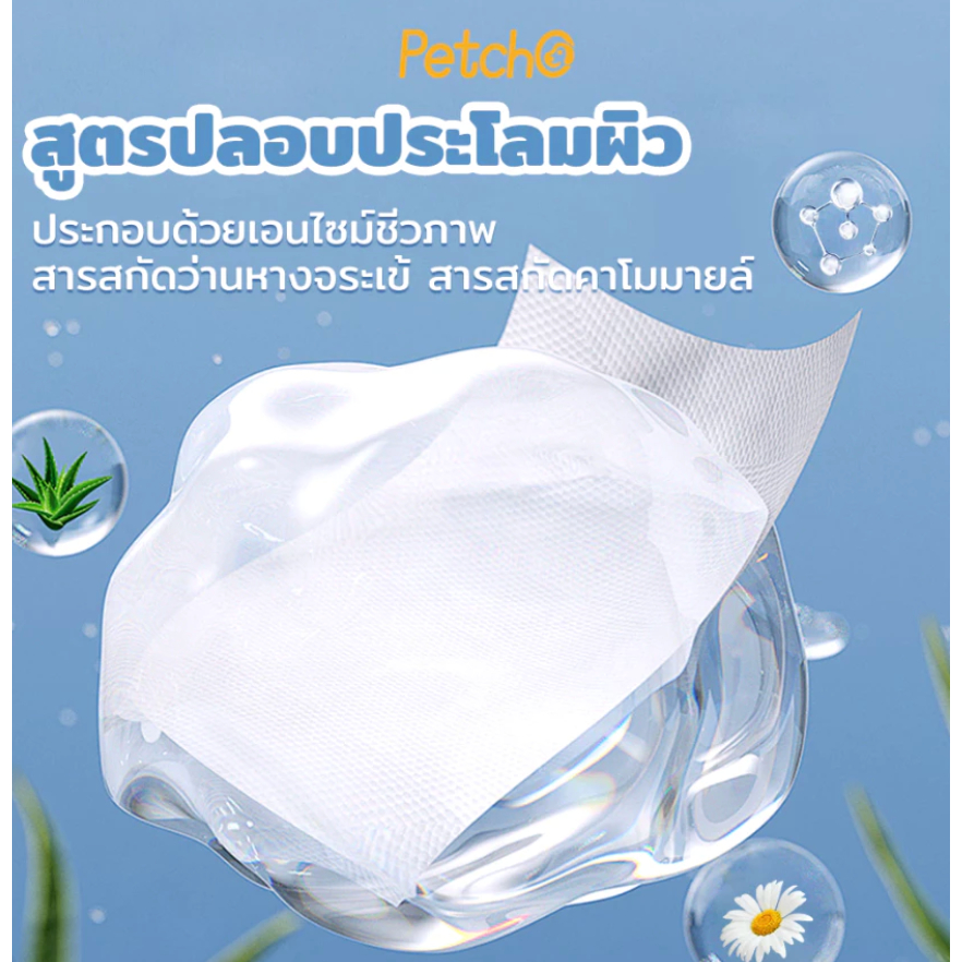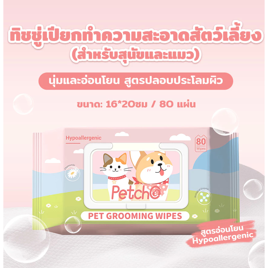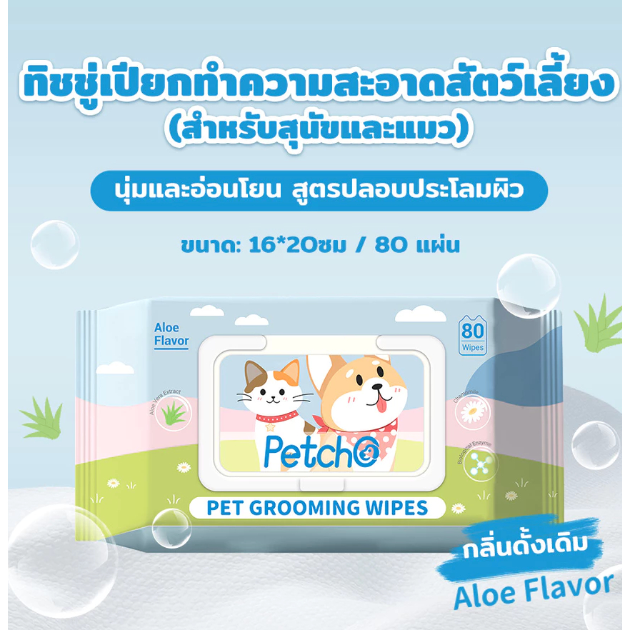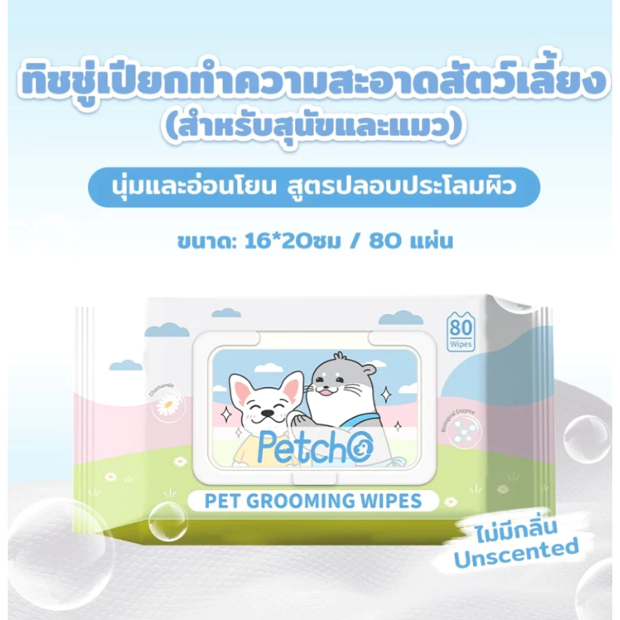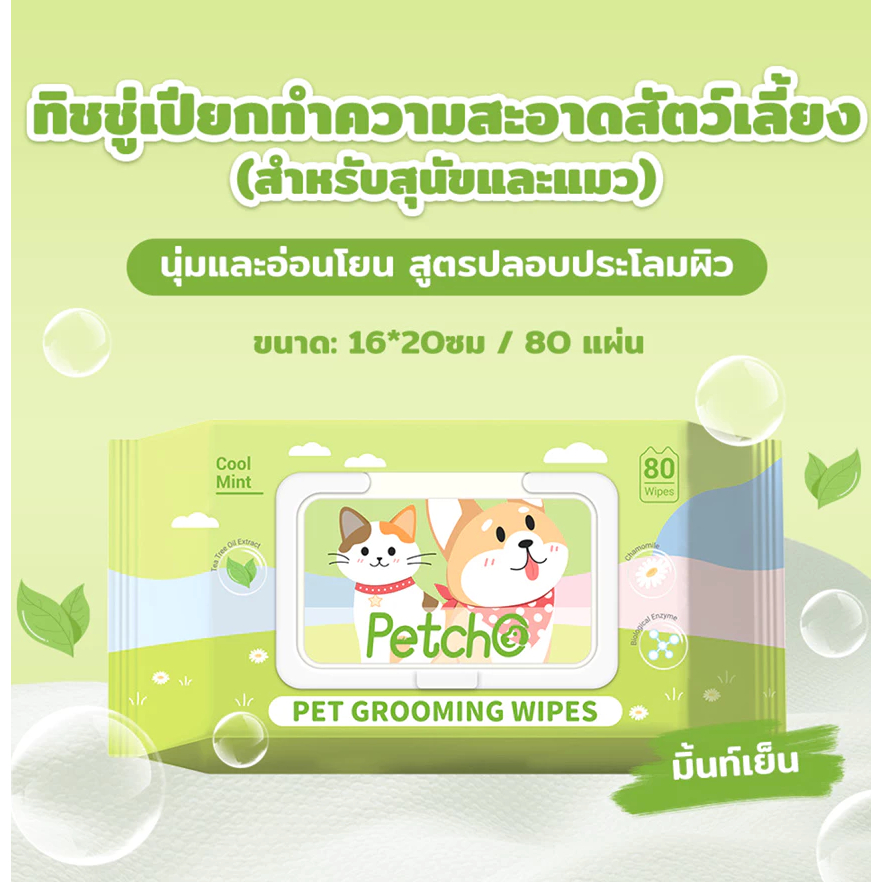 Petcho ทิชชู่เปียก ผ้าเปียกทำความสะอาดสัตว์เลี้ยง อ่อนโยน ปราศจากแอลกออล์ 80 แผ่น
