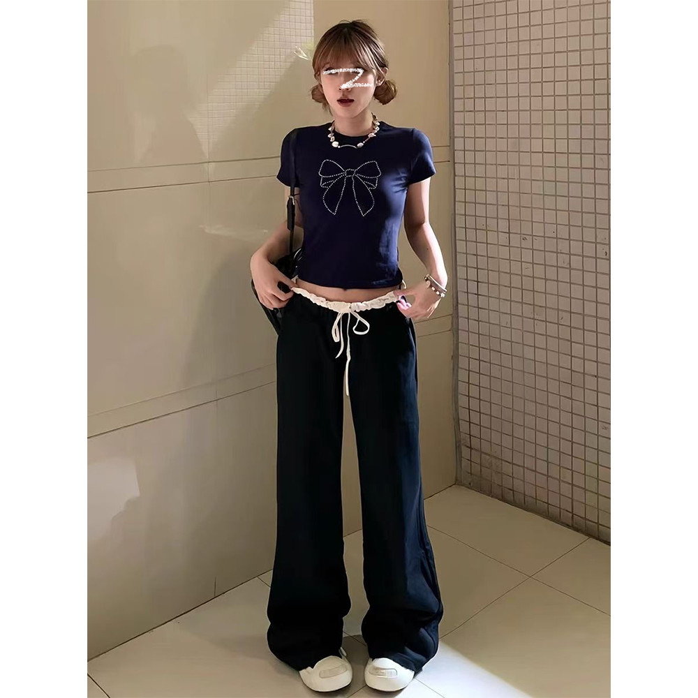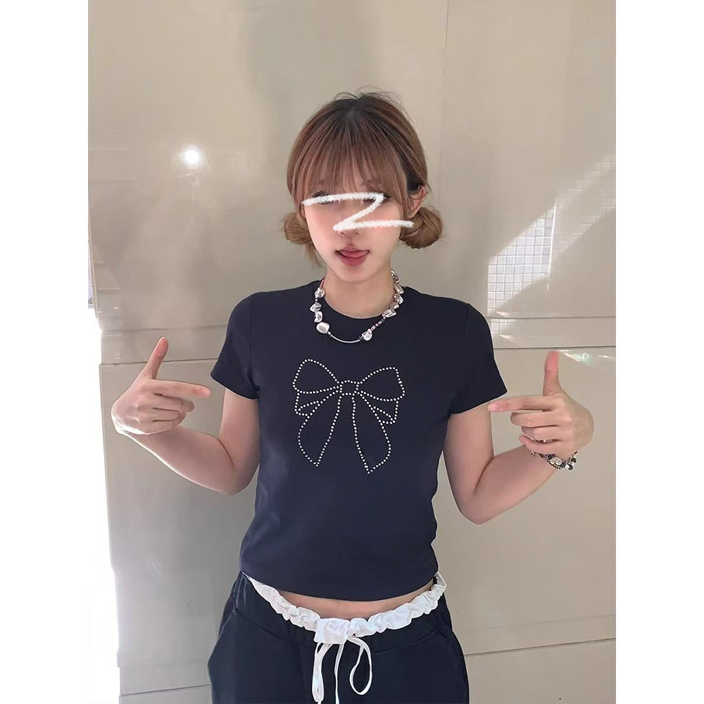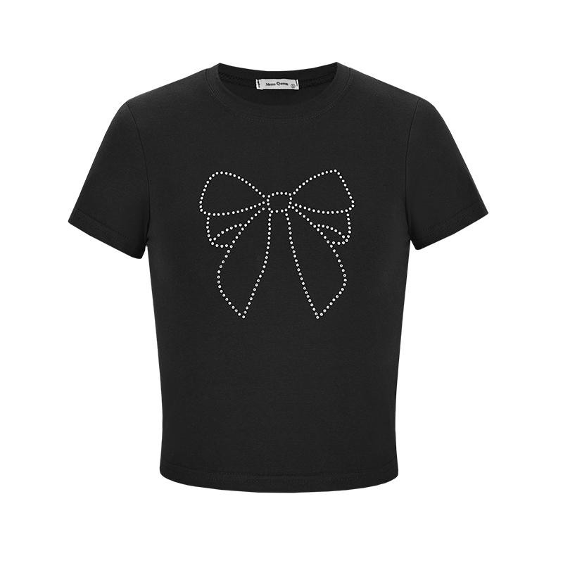 Moses Queen/Queen of Mercy เสื้อยืดแขนสั้นทรงสลิมสไตล์เรโทรอเมริกันสำหรับผู้หญิง ดีไซน์ด้วยโบว์และประดับเพชรเทียม เสื้อตัวสั้นทรงสลิมและน่ารัก