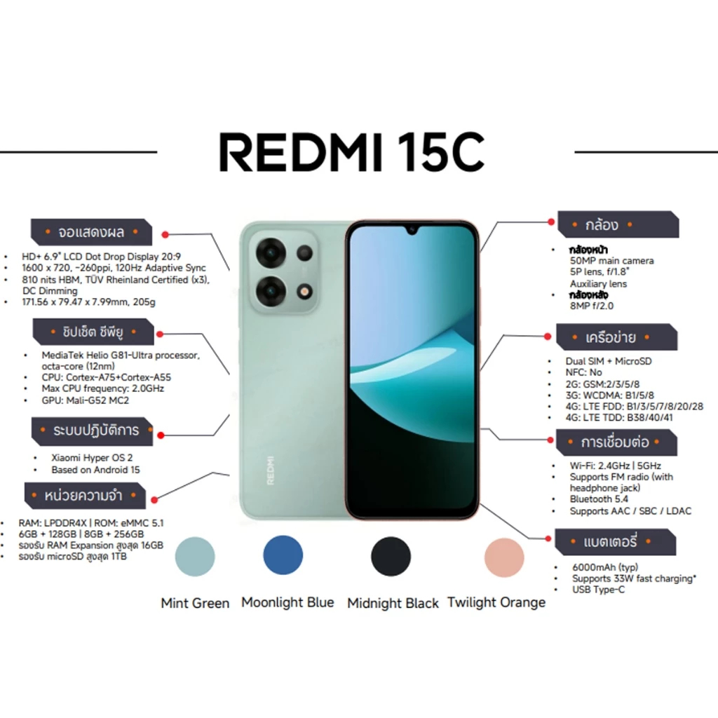[ใหม่]Redmi 15C 8+256 จอใหญ่ เต็มตา 6.9 นิ้ว ความละเอียด HD+ กล้องคมชัด 50MPพร้อม AI แบตอึดเต็มวัน 6000mAh