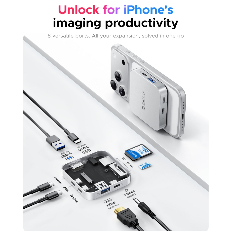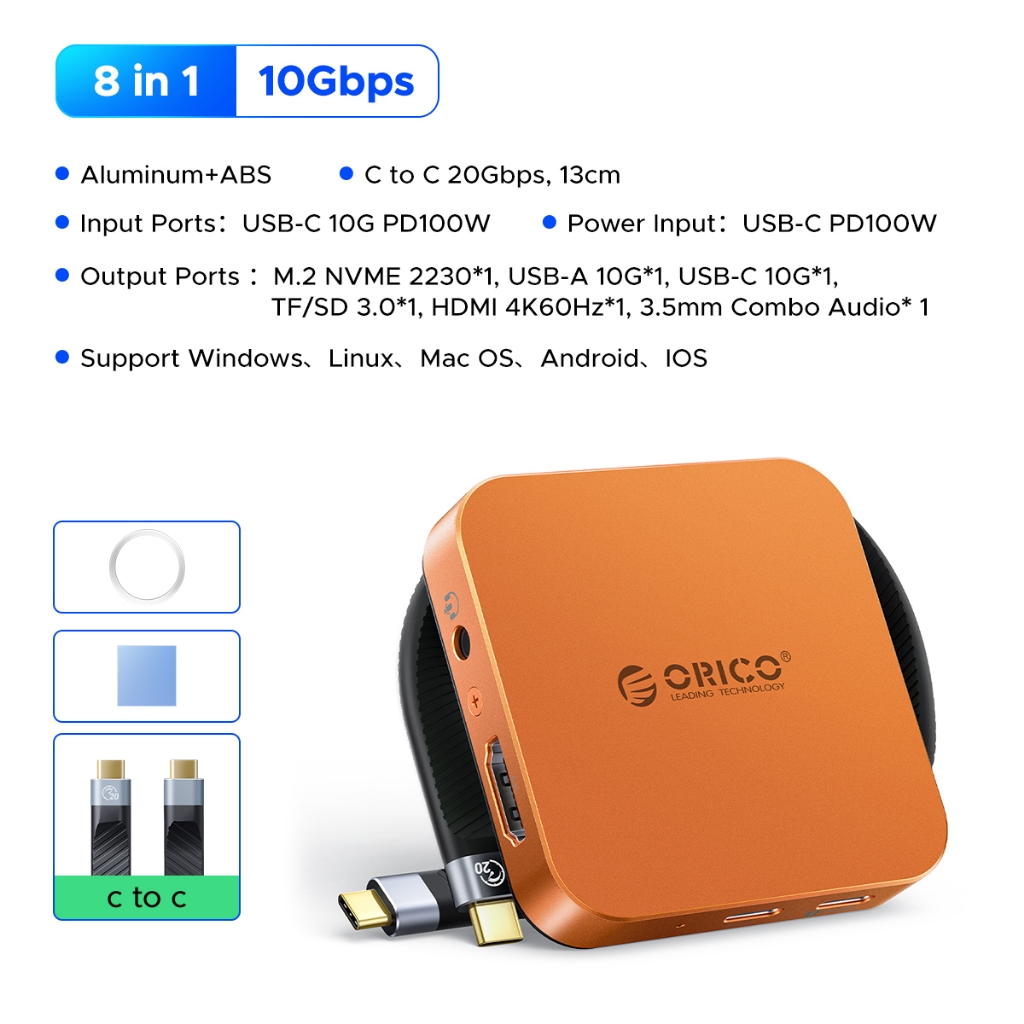ORICO 8 in 1 Docking Station แม่เหล็ก USB C Hub TF/SD 3.0 PD 100W Hub พร้อม Ethernet 4K to HDMI VGA PD Power USB 3.0 รองรับ M.2 2230(MG)