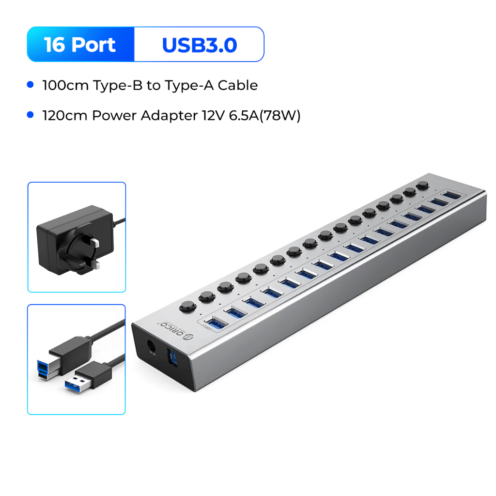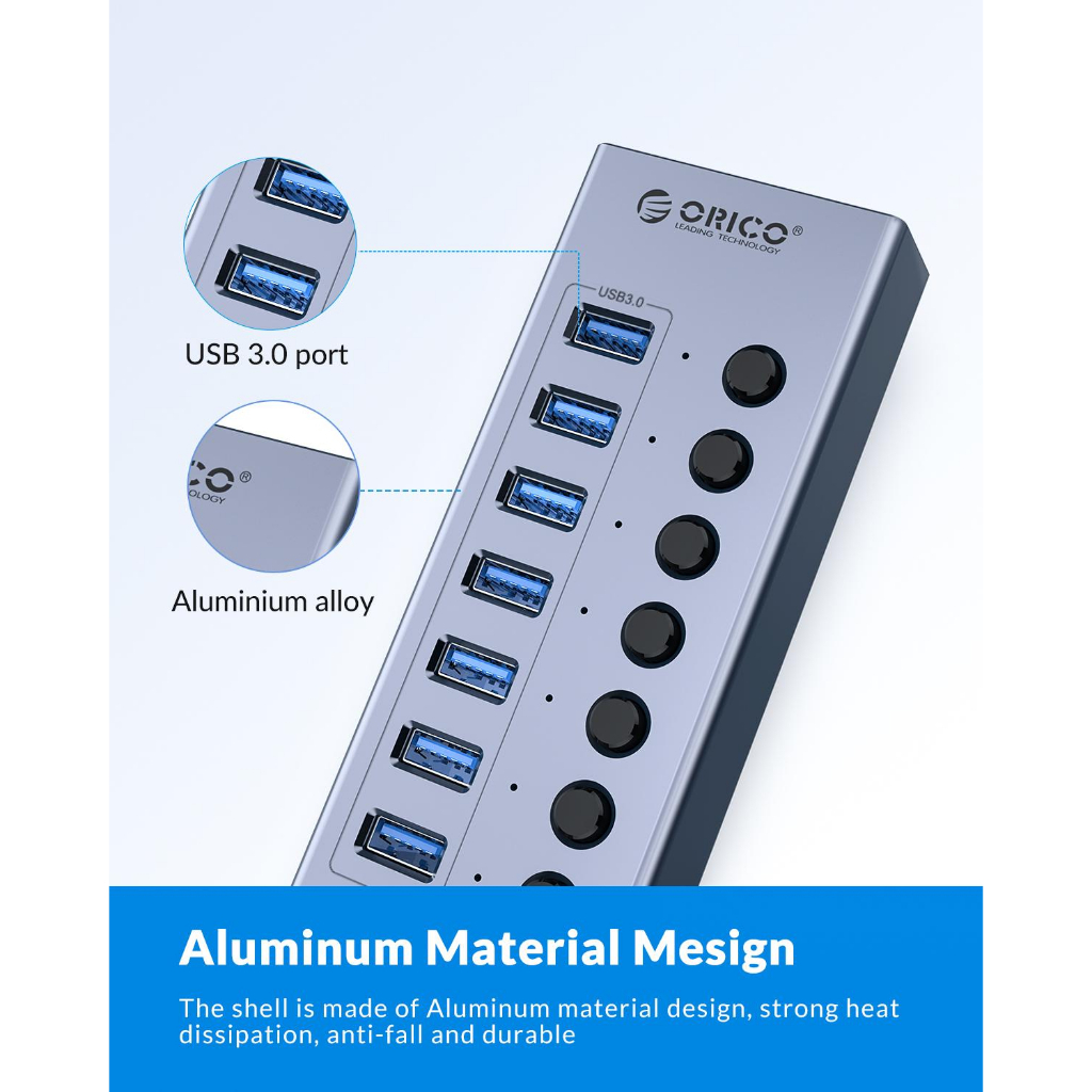 Orico อุตสาหกรรม USB 3.0 HUB 7/10/13/16 อลูมิเนียม USB Splitter เปิด/ปิดสวิทช์ 12V Power Adapter รองรับการชาร์จสําหรับคอมพิวเตอร์ (BT2U3)