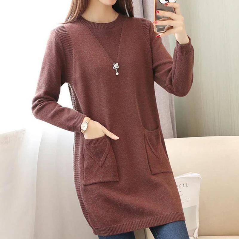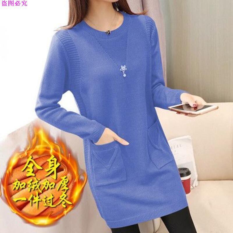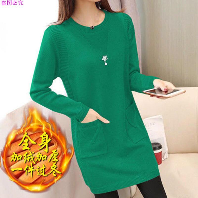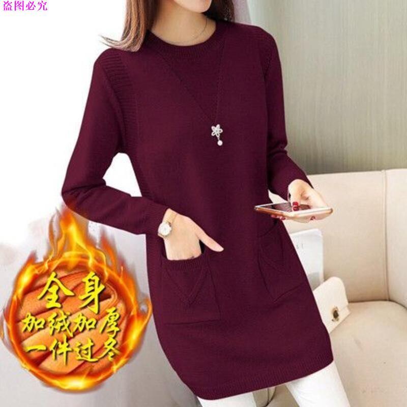 ขนแปรงหนาเสริมเสื้อกันหนาวผู้หญิงหลวมกลางความยาวถักเสื้อ จุดต่ําสุด ฤดูใบไม้ร่วงฤดูหนาวที่อบอุ่นเวอร์ชั่นเกาหลีเสื้อกันหนาวชุ