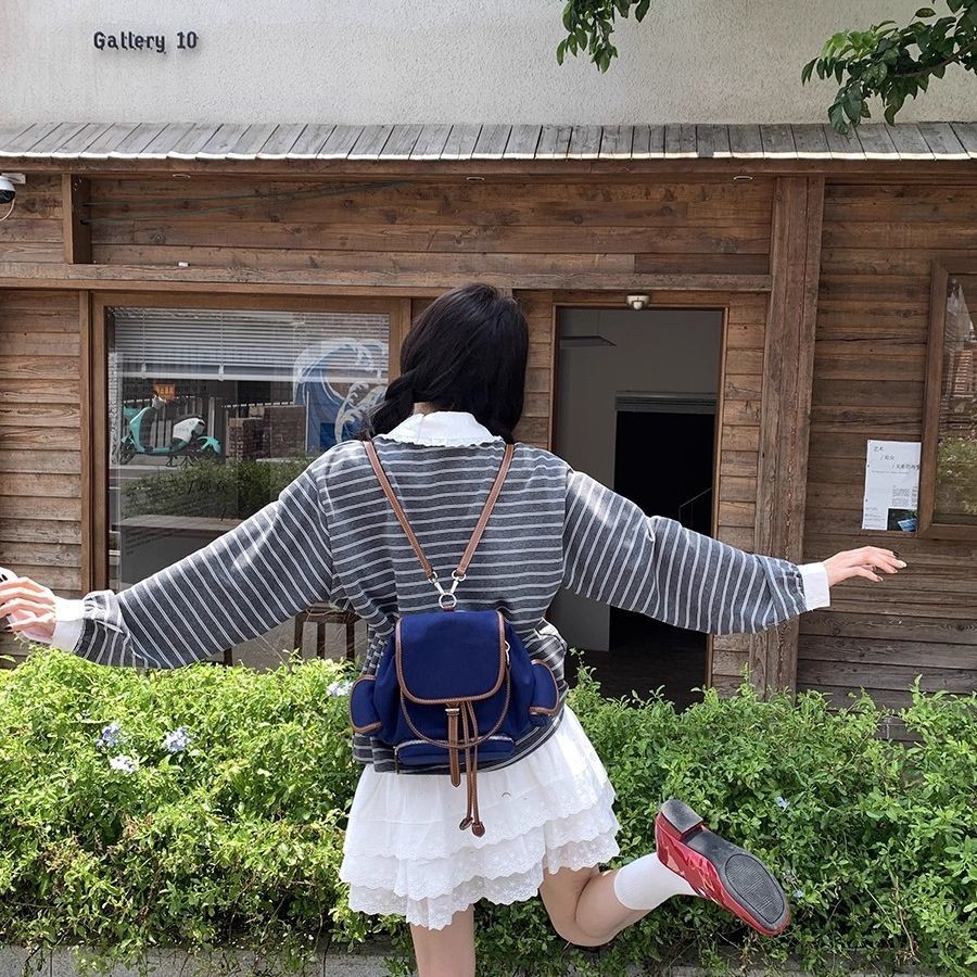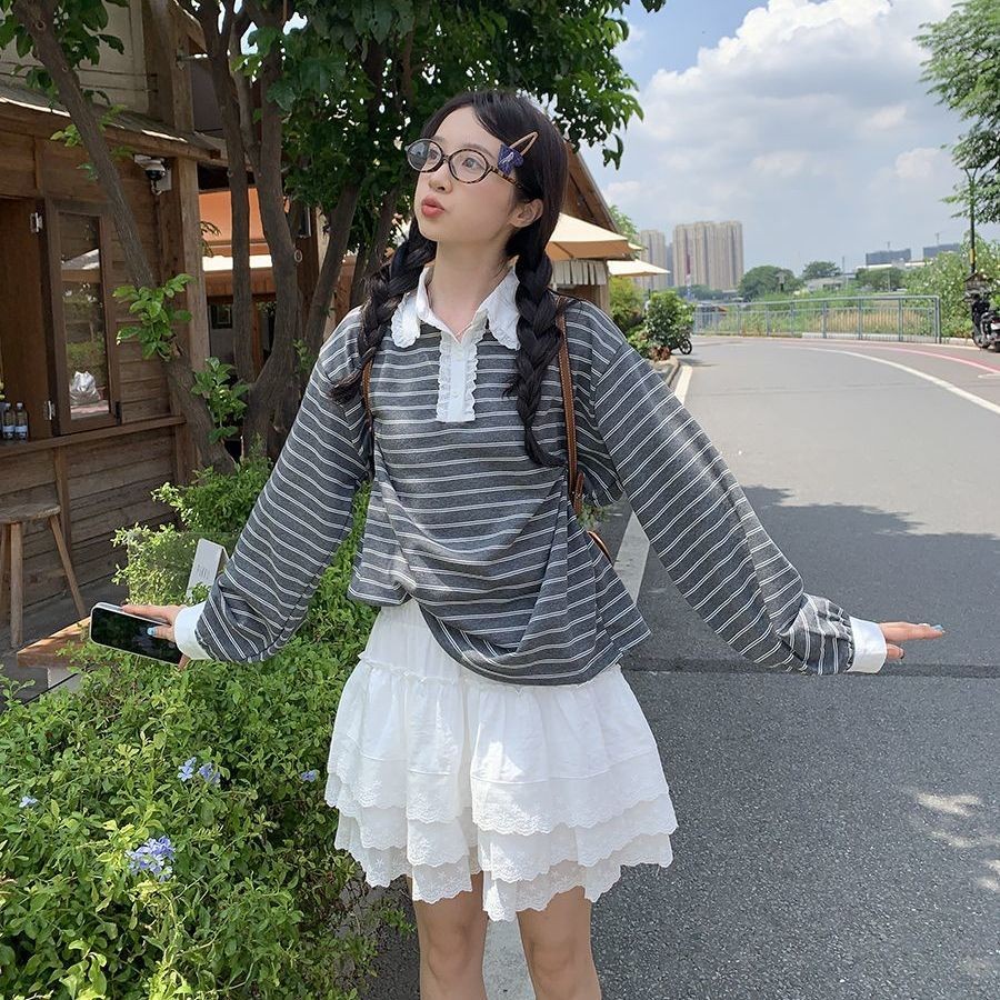 [สินค้าพร้อมส่ง] POLO TOP ฤดูใบไม้ร่วงใหม่เกาหลีหวานลูกไม้ประกบสีสันโปโลคอลายแขนยาวเสื้อยืดคอปกเสื้อกันหนาว