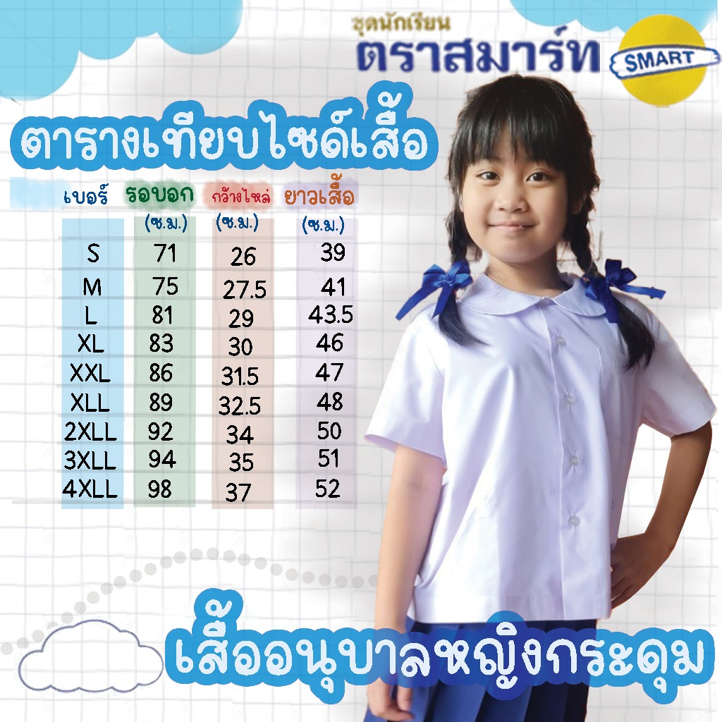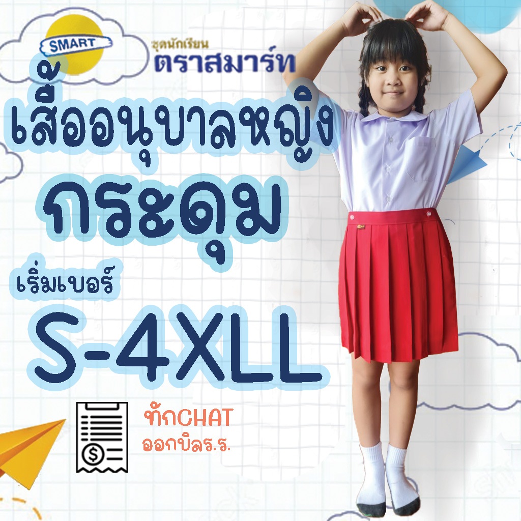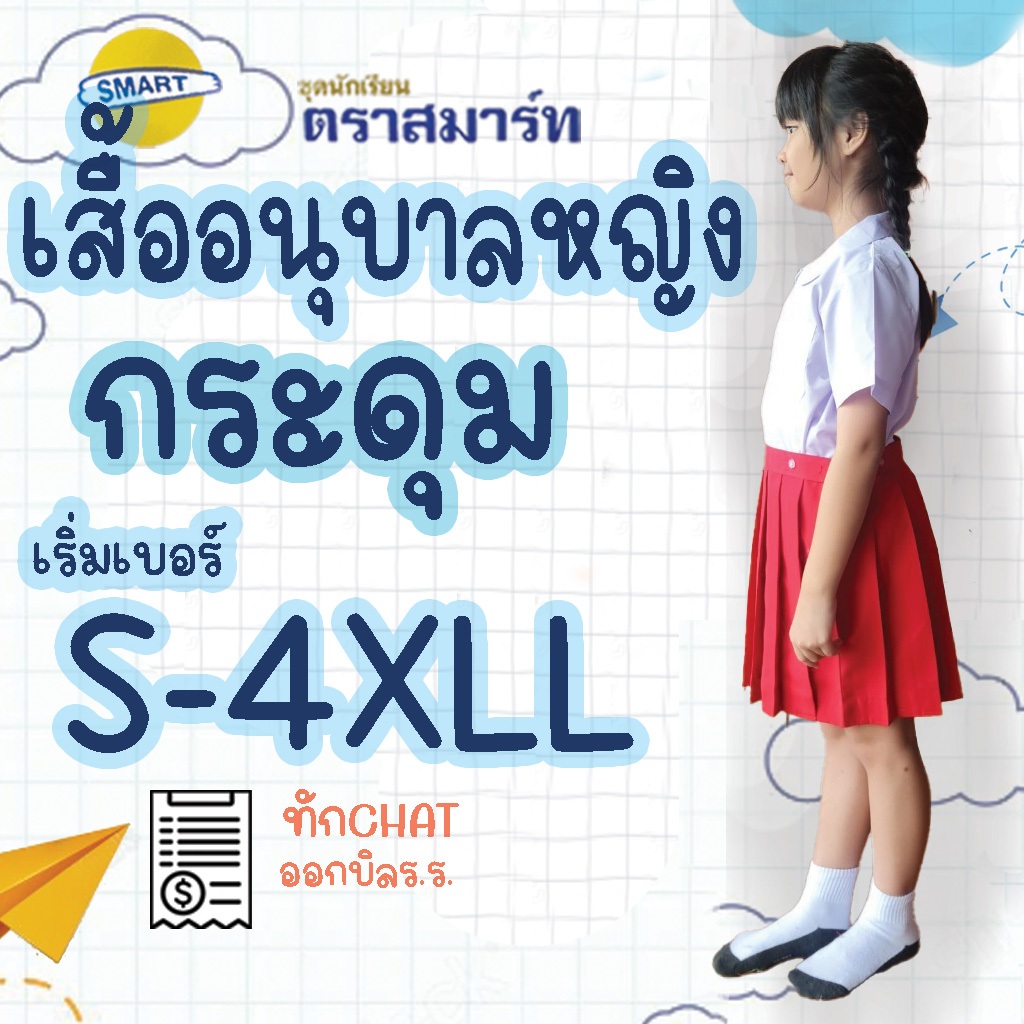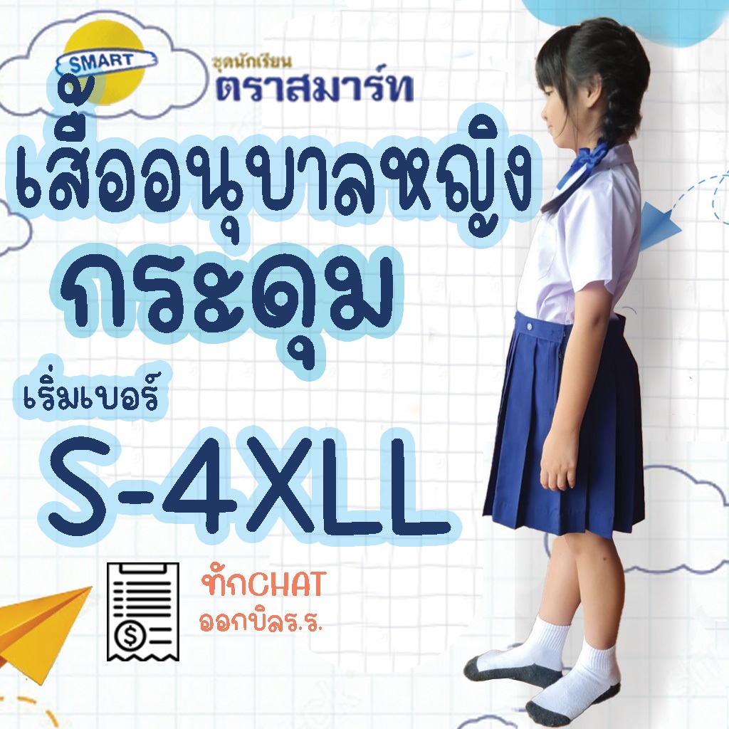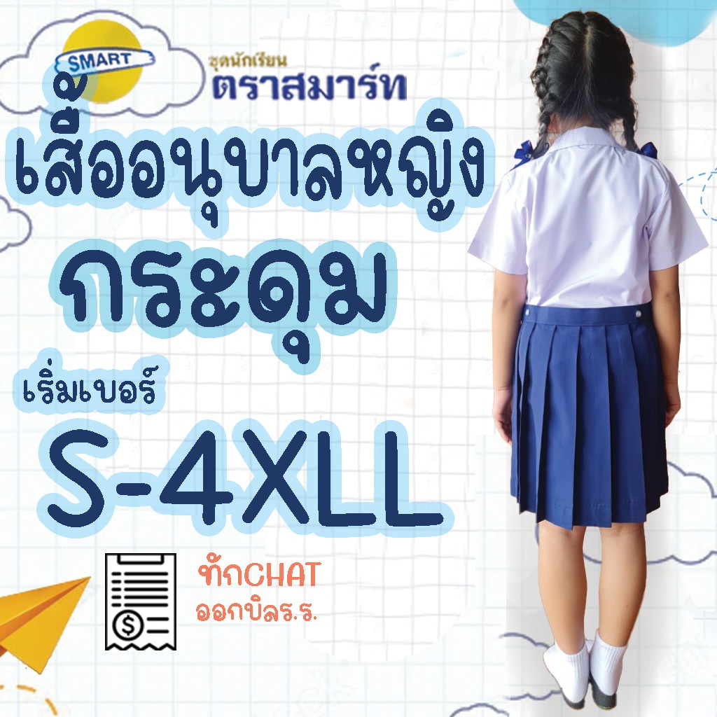 เสื้ออนุบาลหญิงกระดุม ตราสมาร์ท SMART มีบริการปักชื่อด้วยระบบคอมพิวเตอร์ เสื้อนักเรียนหญิง