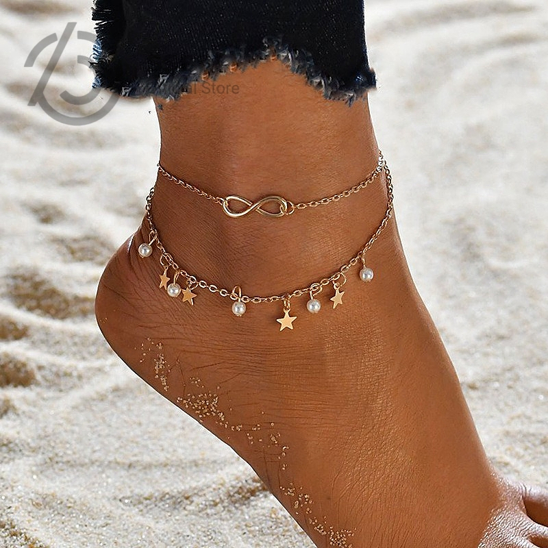 SSB สร้อยข้อเท้าชายหาด วงกลมคู่ดาวมุกพู่ระย้า กันน้ำไม่หมอง ของขวัญสุดชิค B006