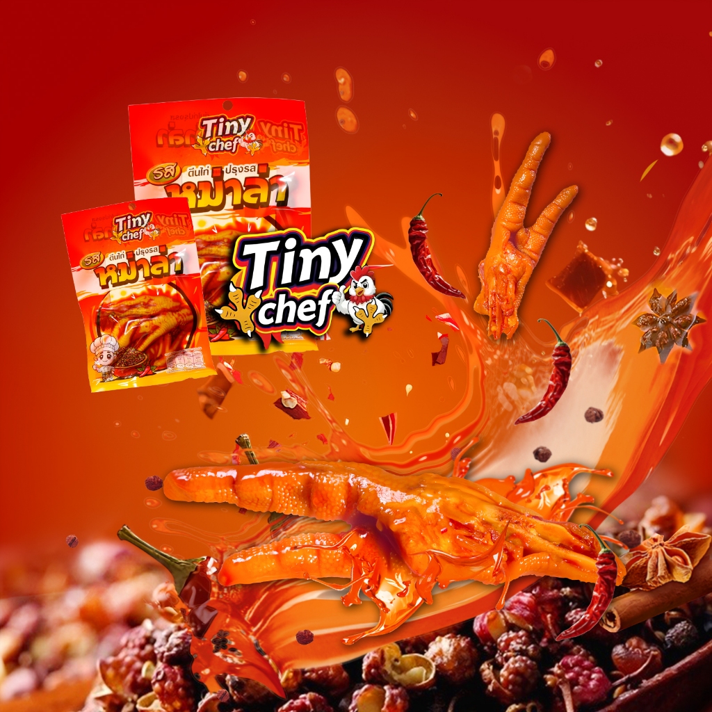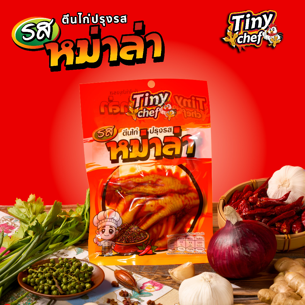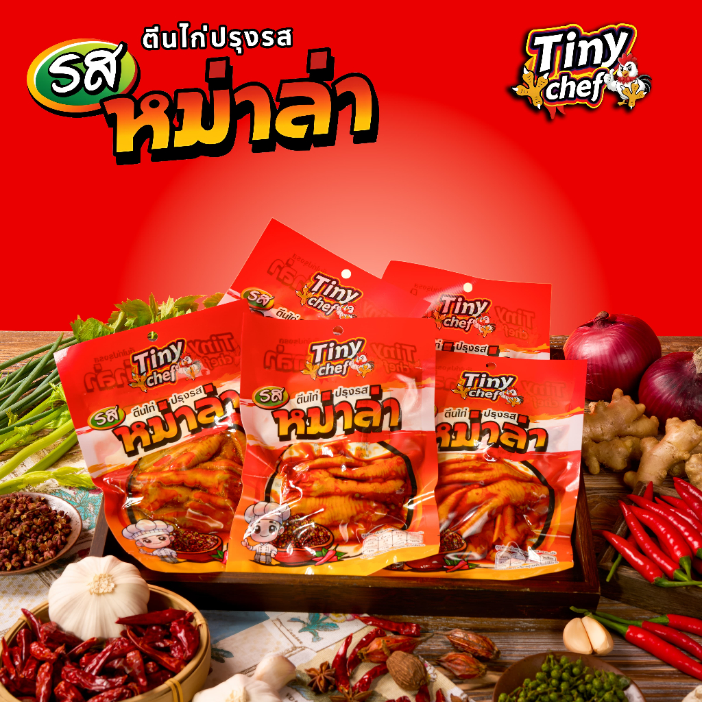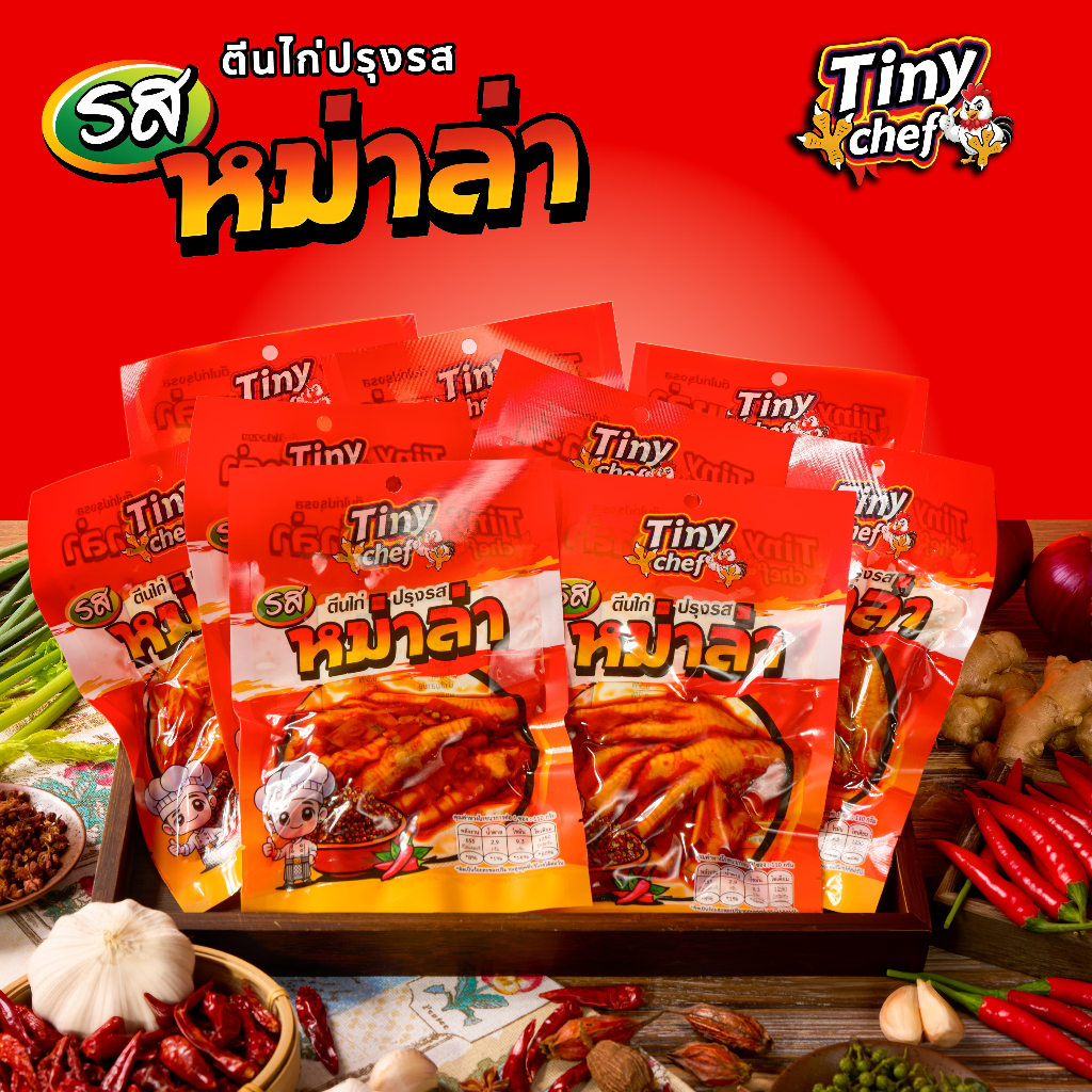Tiny Chef ตีนไก่รสหม่าล่า ผลิตในประเทศไทย มี อย. รสชาติเผ็ดชาลิ้น รสสัมผัสนุ่มหนึบ ของทานเล่นขณะดูซีรี่ย์ แบบแซ่บๆ