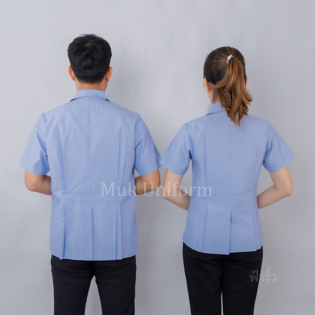 ( live 11.30 - 13.00 น.ทุกวัน ) เสื้อกาวน์ฟ้าริ้ว คอปก แขนสั้น ฟ้า-ขาว ไม่มีโลโก้ มุกยูนิฟอร์ม