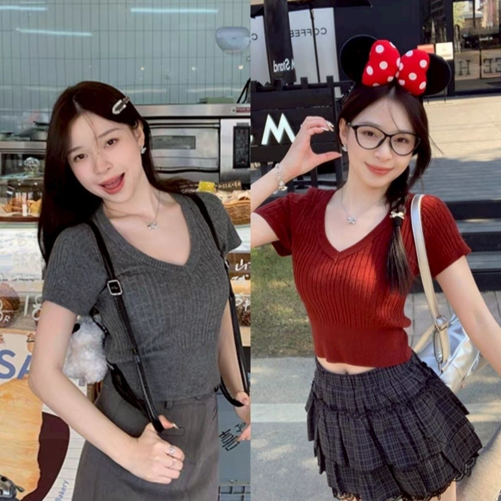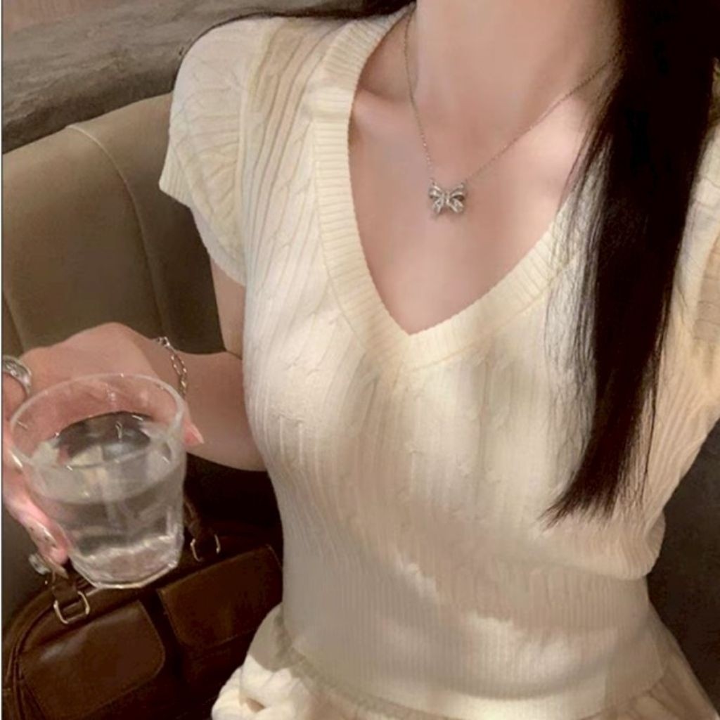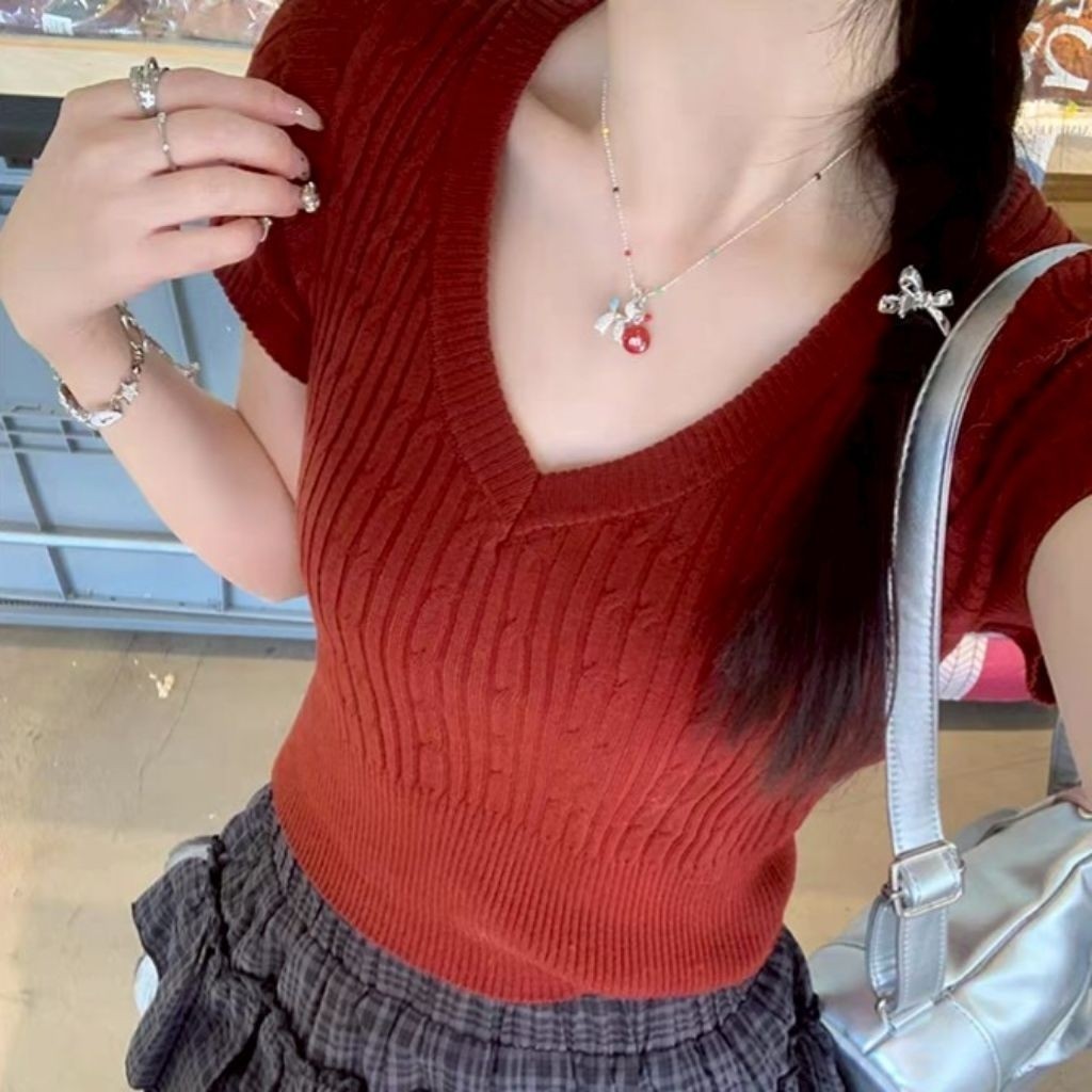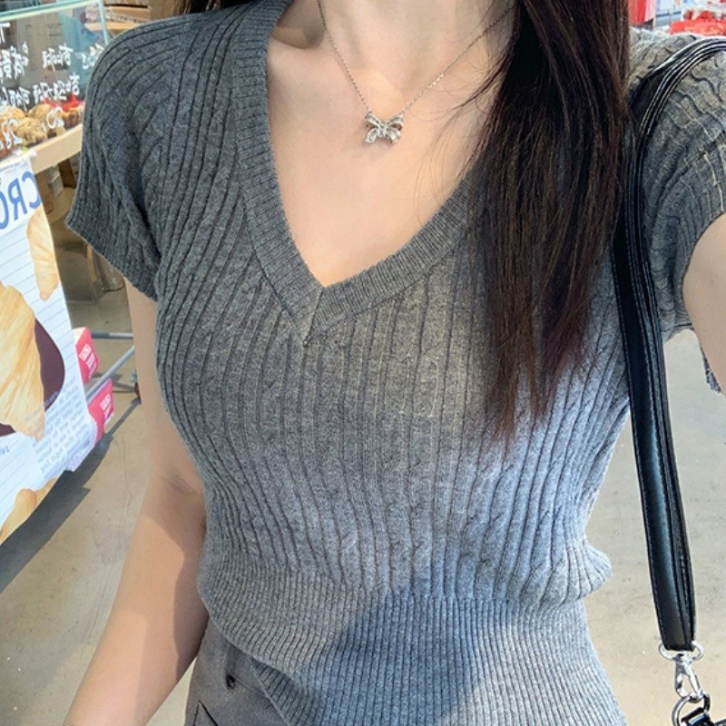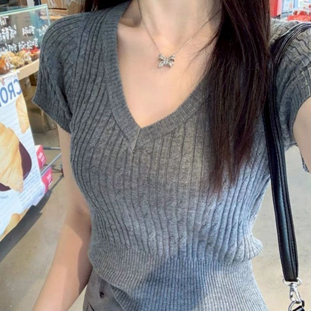 เสื้อคอวีไหมพรม แขนสั้นครอป ยืดพอดีใส่ง่าย สไตล์เกาหลี หรูหรา เสื้อแฟชั่นผู้หญิง
