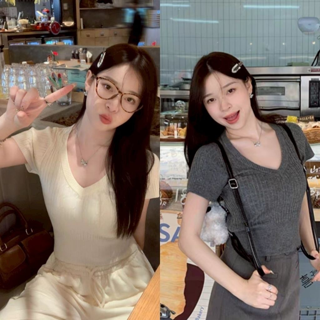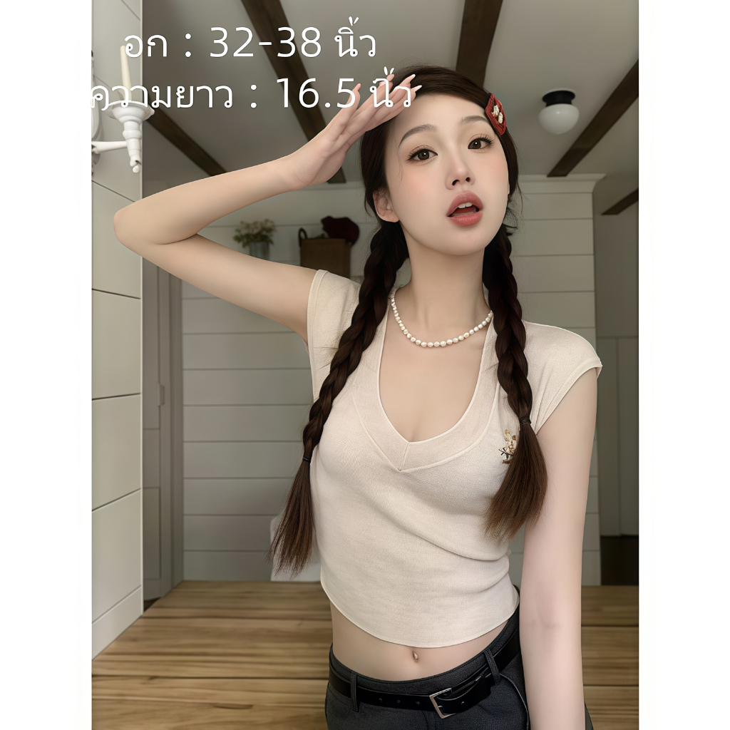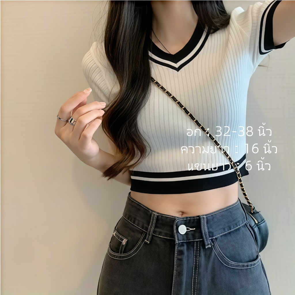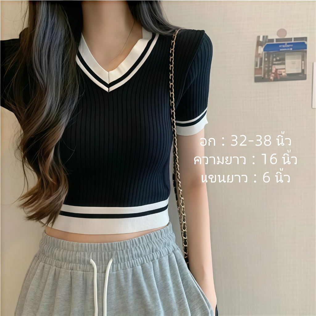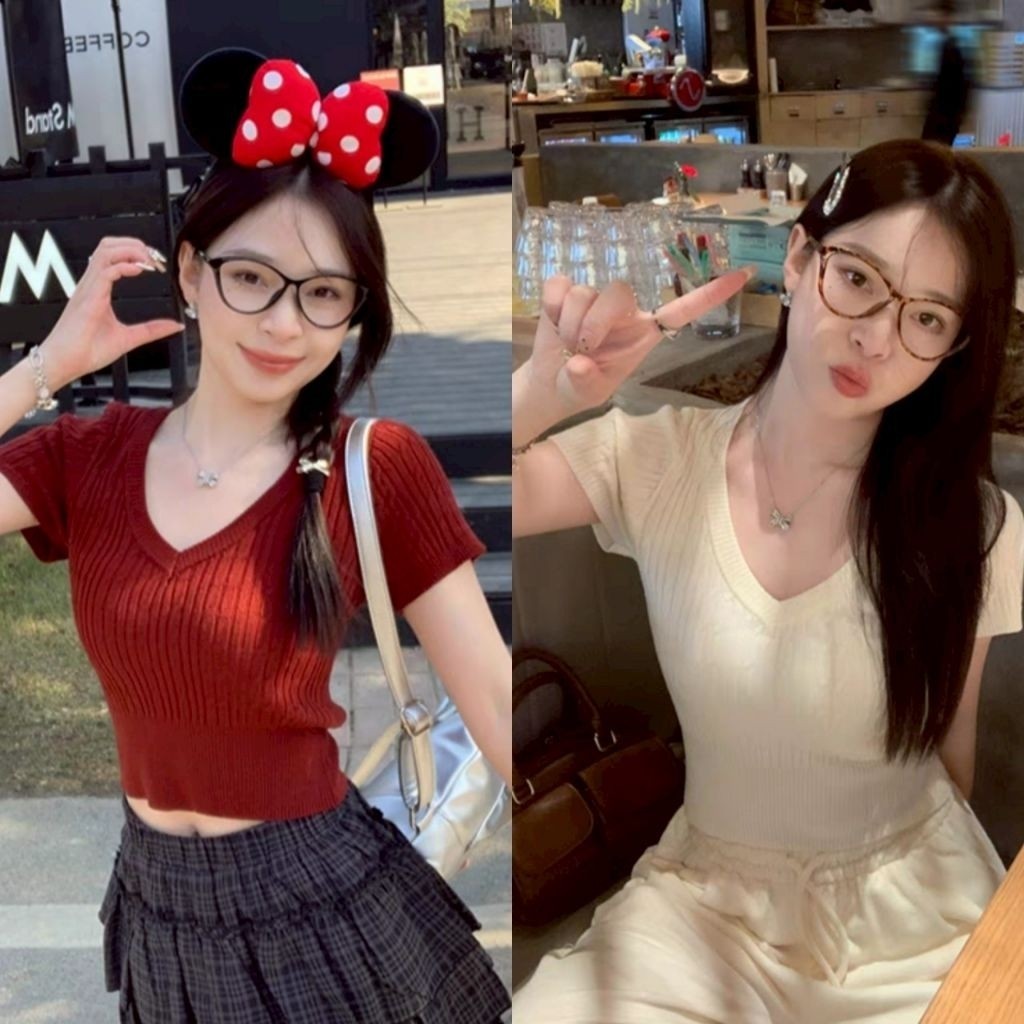 เสื้อคอวีไหมพรม แขนสั้นครอป ยืดพอดีใส่ง่าย สไตล์เกาหลี หรูหรา เสื้อแฟชั่นผู้หญิง