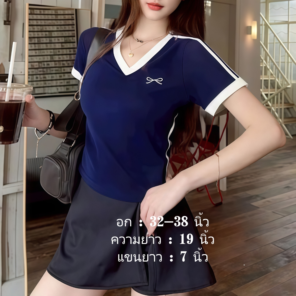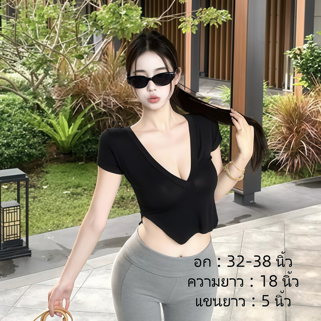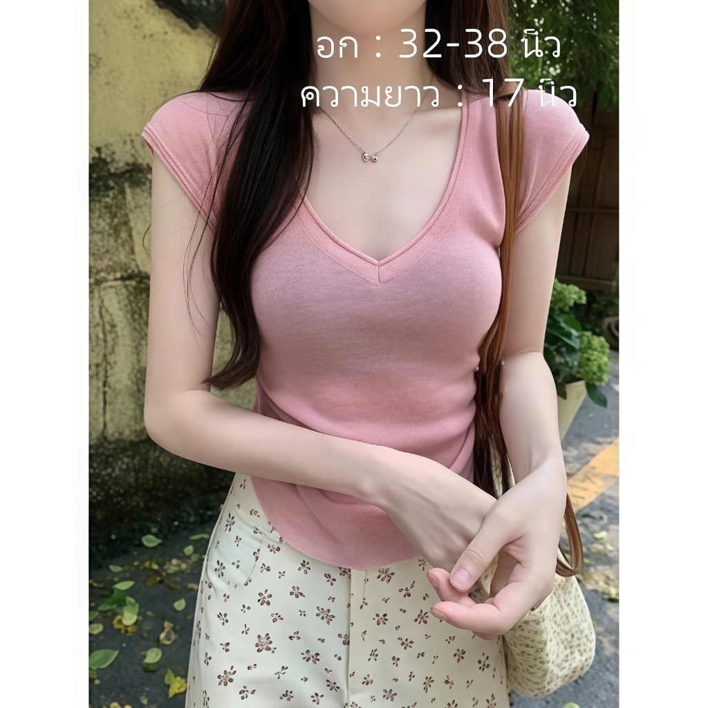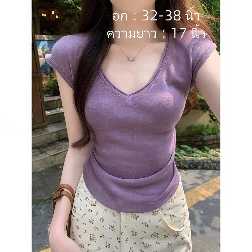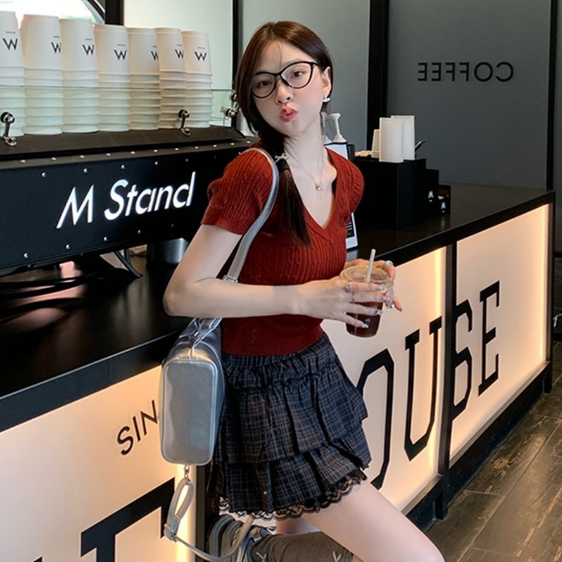เสื้อคอวีไหมพรม แขนสั้นครอป ยืดพอดีใส่ง่าย สไตล์เกาหลี หรูหรา เสื้อแฟชั่นผู้หญิง