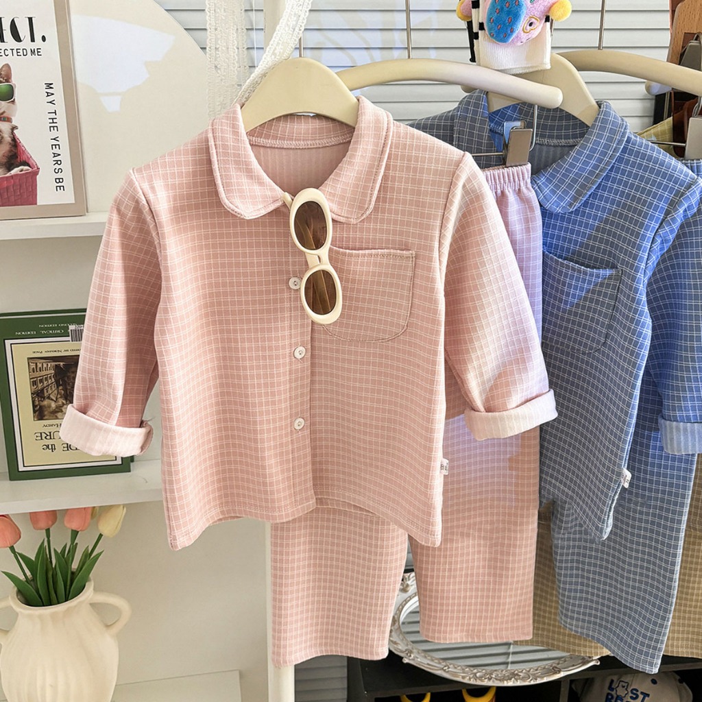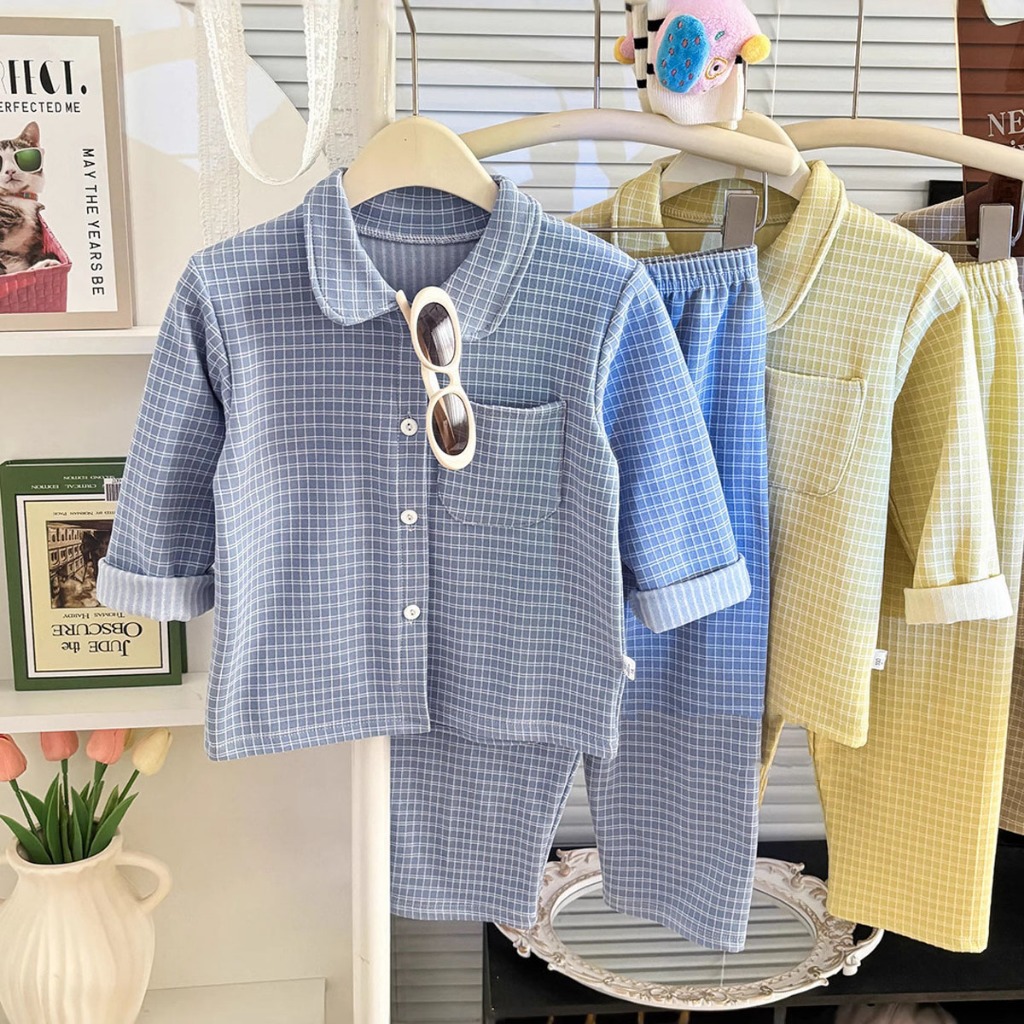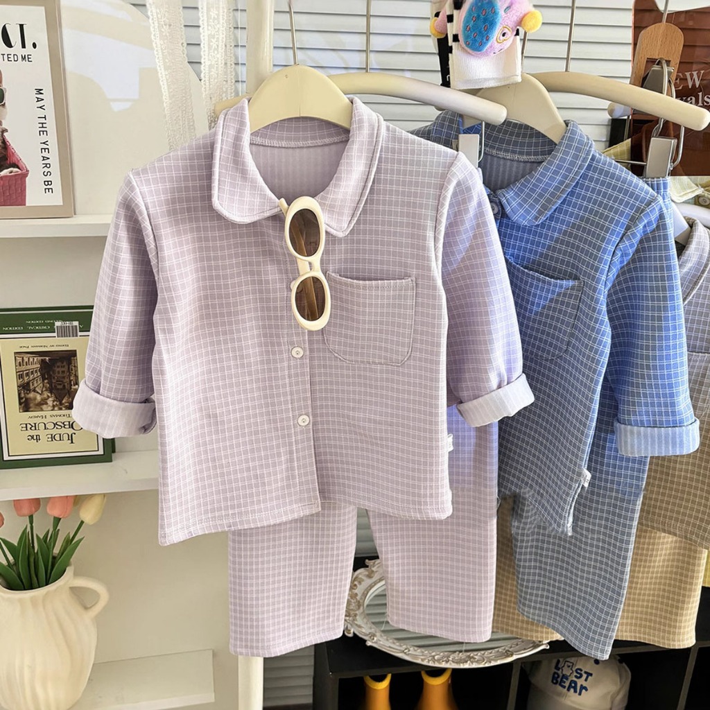 ชุดนอนชุดลำลองเด็ก ชุดลำลองเซ็ต ผ้านุ่มใส่สบาย ลายสก๊อต สีพื้น ลำลอง ไซส์ 90-120