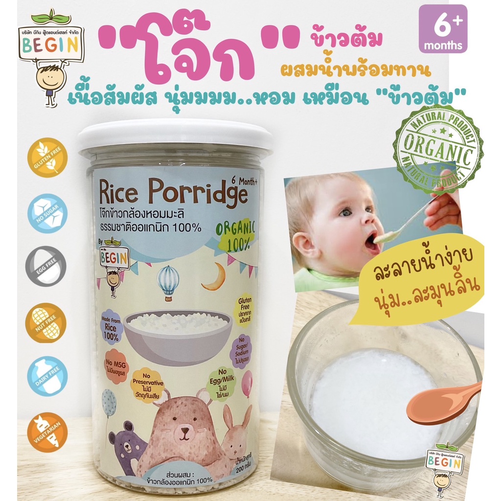 Begin “โจ๊กข้าวต้มหอมมะลิ” ออแกนิค ผสมน้ำพร้อมทาน เนื้อสัมผัสนุ่ม หอม ทานง่าย สำหรับเด็ก 6 เดือนขึ้นไป