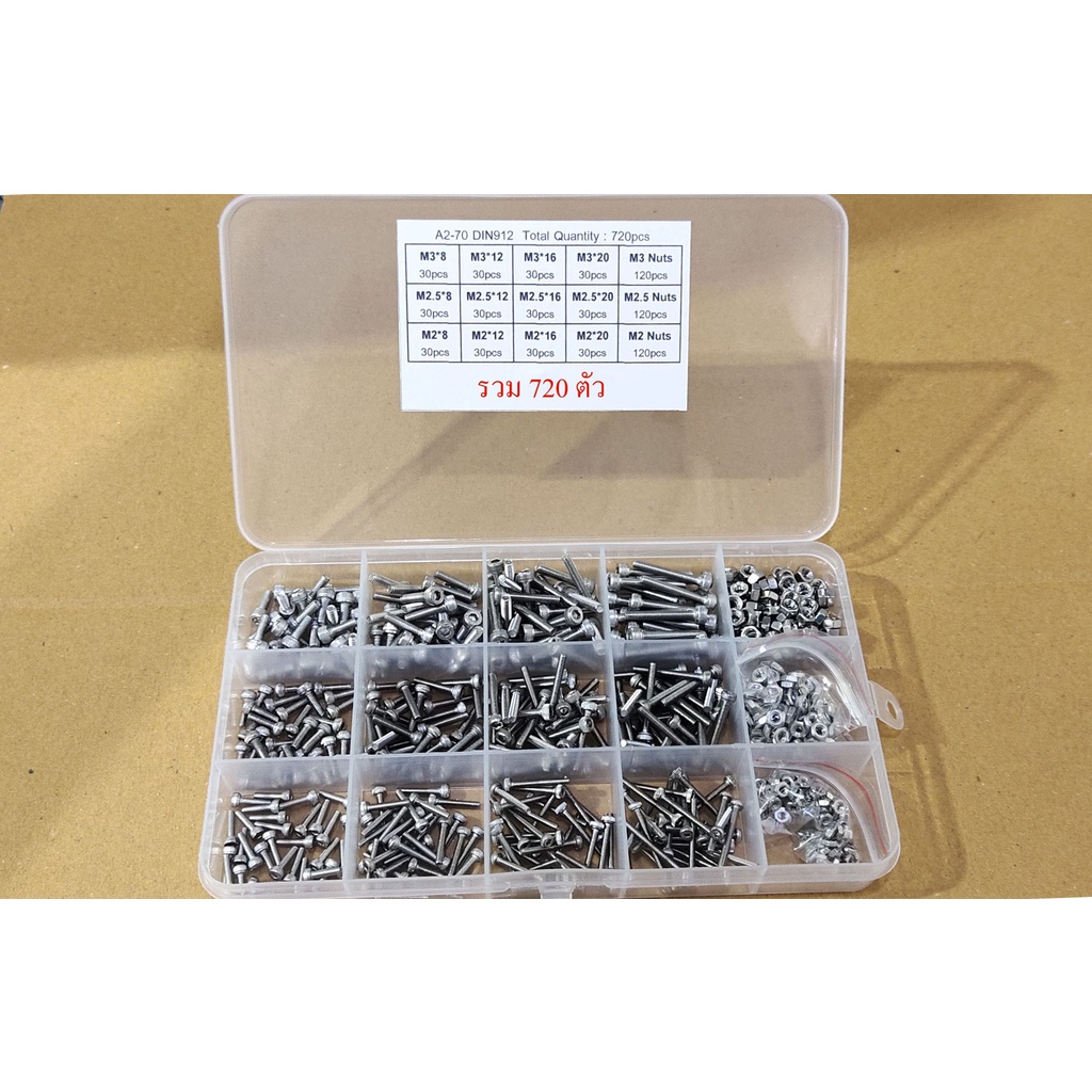 720 ตัว ชุดสกรูสแตนเลสขนาด M2 M2.5 M3 SUS304 สกรู 6 เหลี่ยมหัวจม 912 ส่งจากไทยไม่ต้องกลัวกล่องแตก