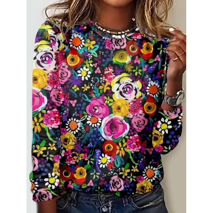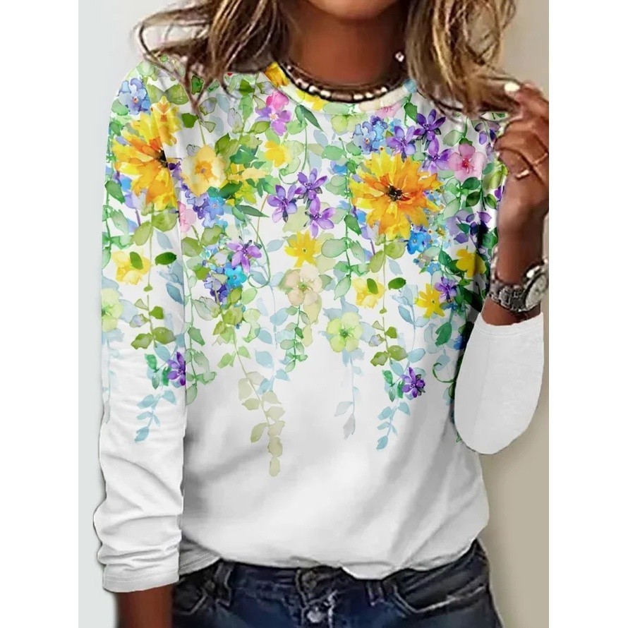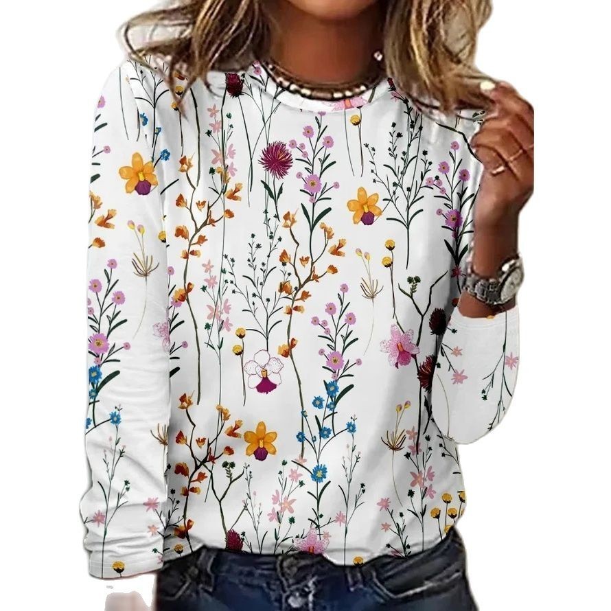 เสื้อยืดแขนยาวพิมพ์ลายดอกไม้ สไตล์วินเทจสำหรับผู้หญิง