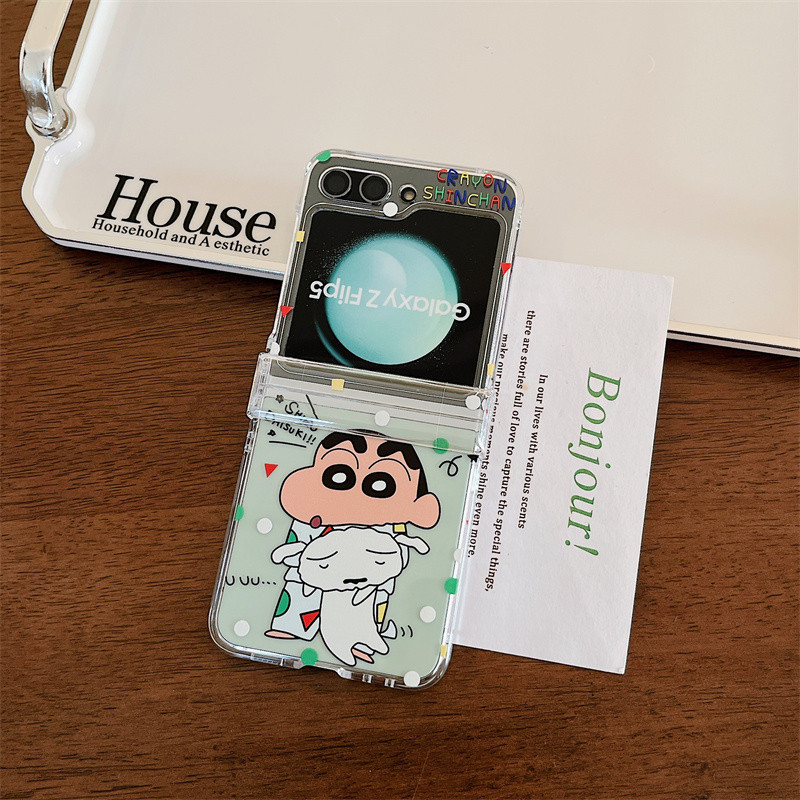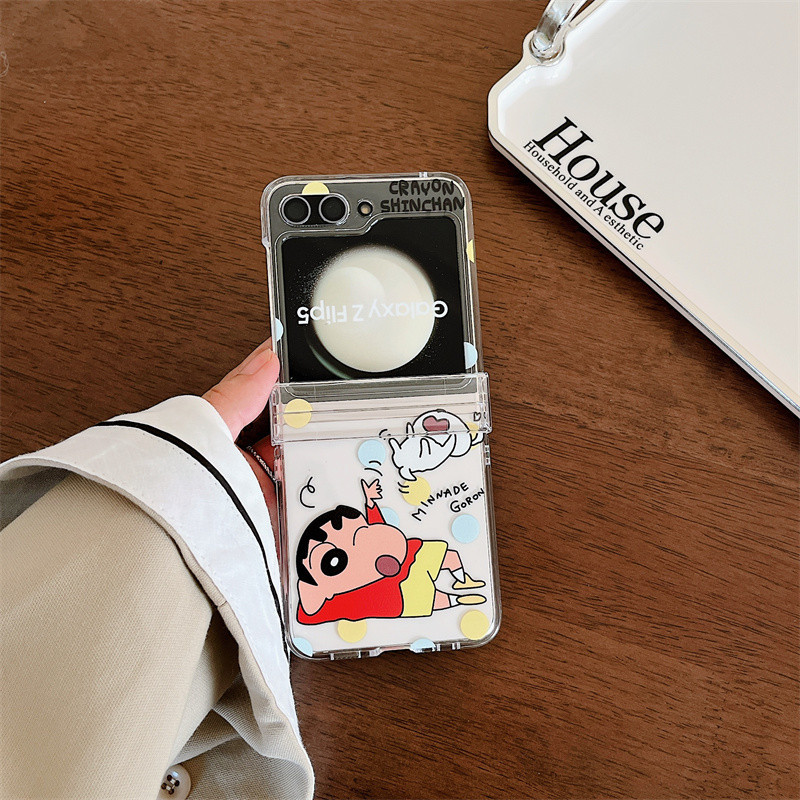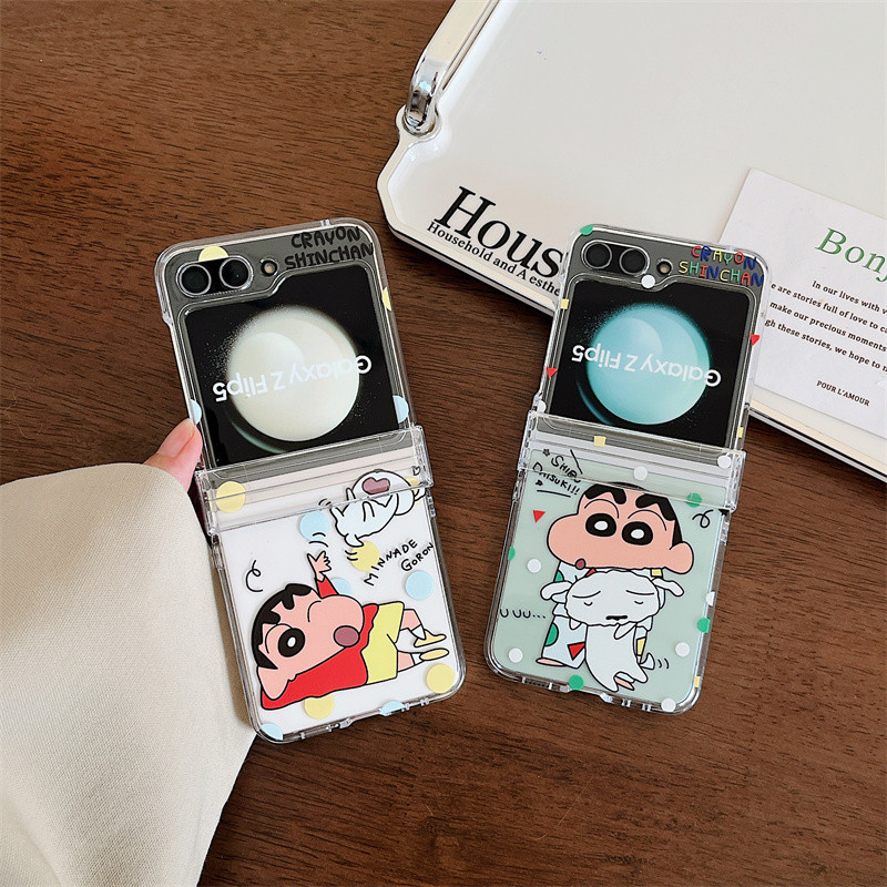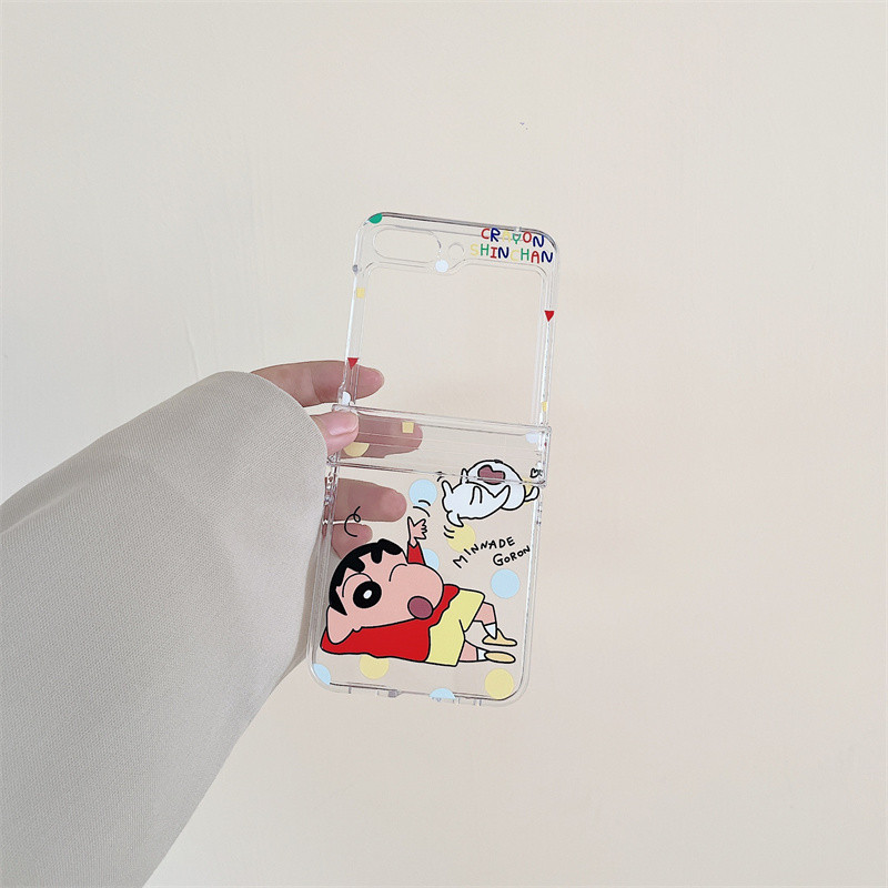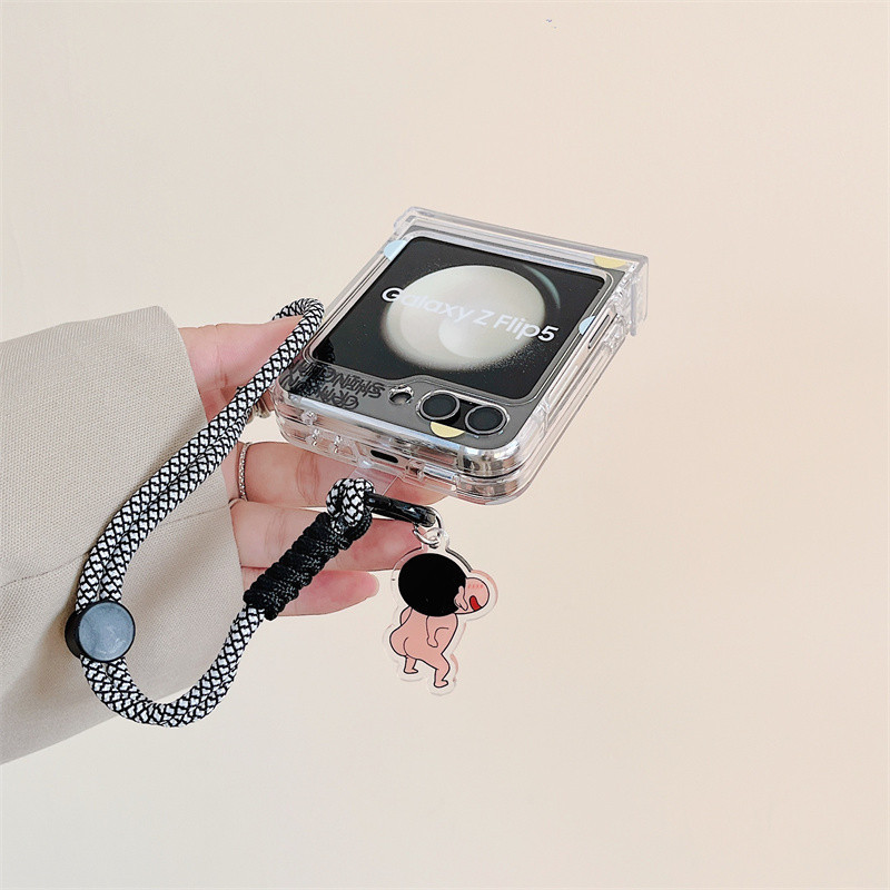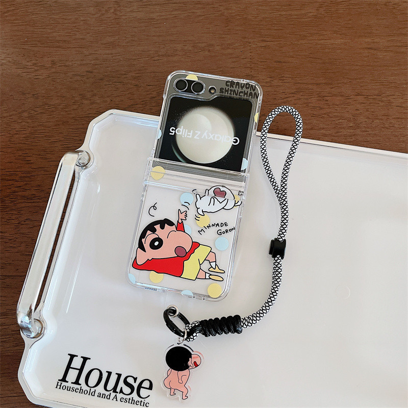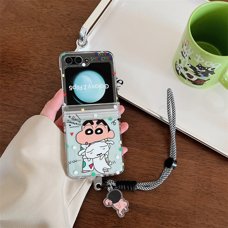 Samsung Z Flip 6/5/4/3 การ์ตูน Caryon Shinchan 3-in-1 Hard โปร่งใสอะคริลิคกรณีไนลอนพวงกุญแจ Lanyard สายคล้องโทรศัพท์สําหรับ Galaxy Z Flip 6 Flip 5 Clear Cover