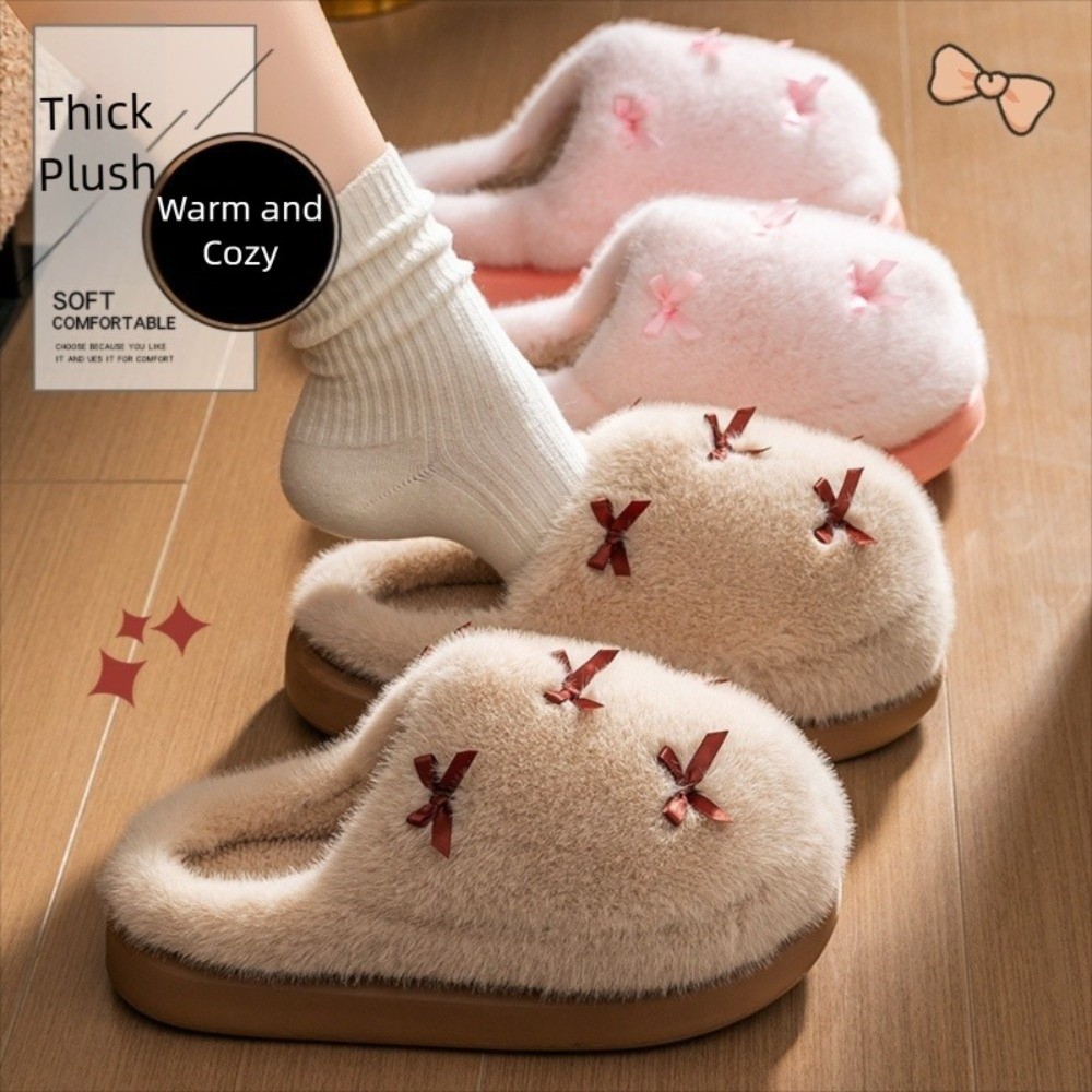 รองเท้าแตะบ้าน.optim แบบขนแกะหนามากอบอุ่น ดีไซน์ลายโบว์แฟชั่น น้ำหนักเบาที่เหมาะสวมใส่ภายในบ้าน